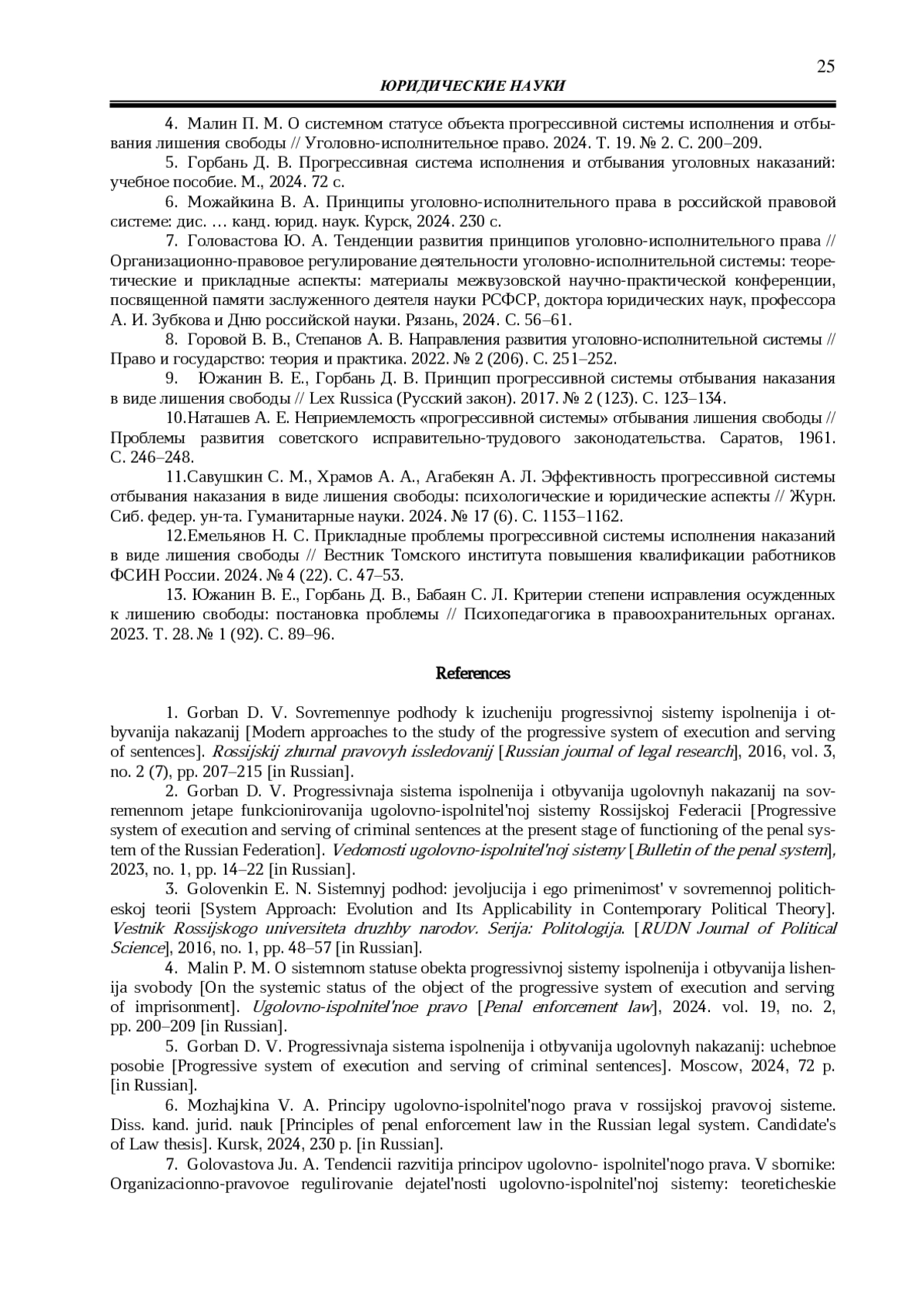 9. Южанин В. Е., Горбань Д. В. Принцип прогрессивной системы отбывания наказания в виде лишения свободы // Lex Russica (Русский закон). 2017. № 2 (123). С. 123-134. EDN: YJJUTD
