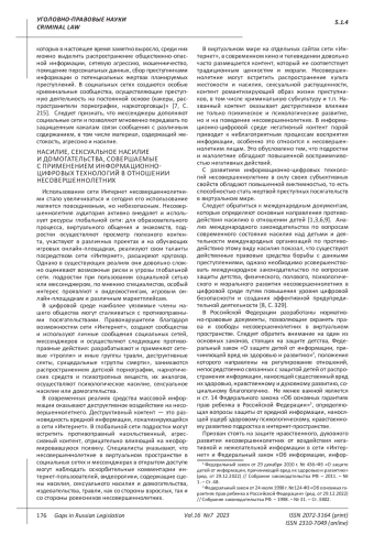 Sashenkov S. A. Criminogenic influence of social networks on minors / S. A. Sashenkov // Bulletin of the Voronezh Institute of the Ministry of Internal Affairs of Russia. - 2015. - No. 3. - P. 215-219. EDN: UMIFUT
