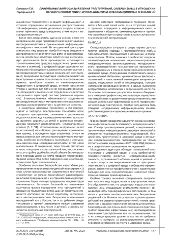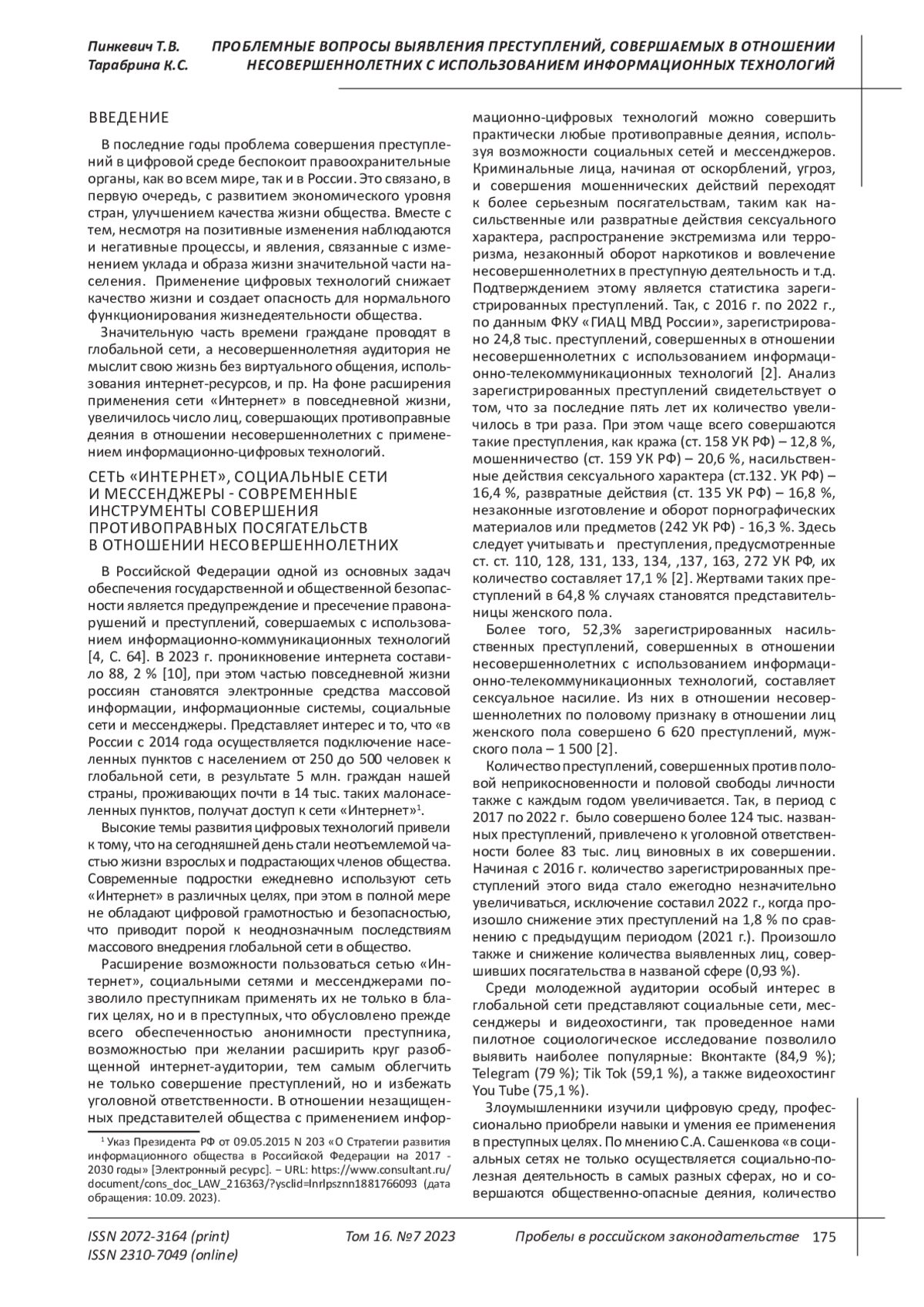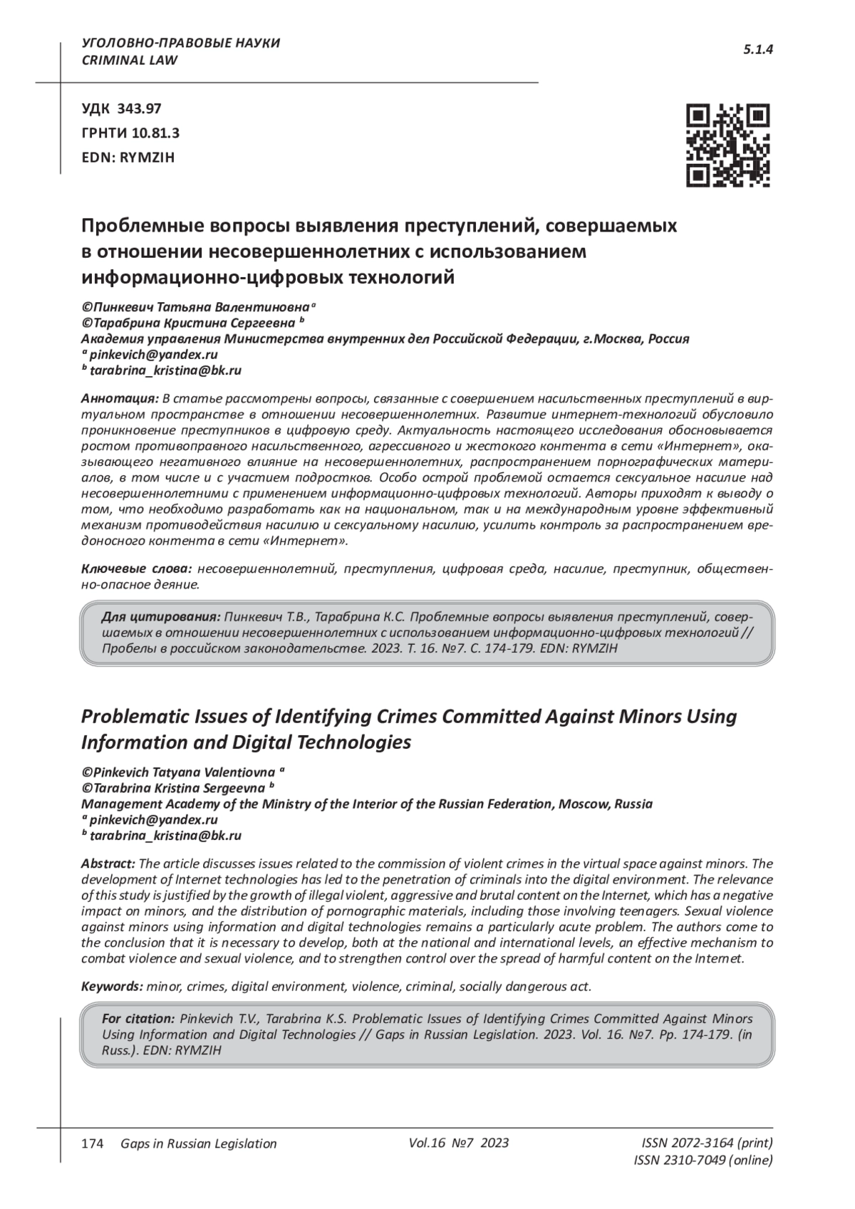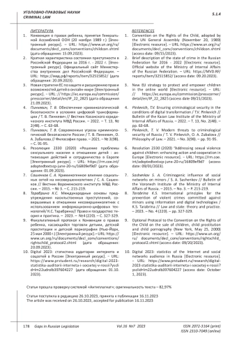 8. Тарабрина К.С. Международные основы предупреждения насильственных преступлений, совершаемых в отношении несовершеннолетних с использованием информационно-цифровых технологий/ К.С. Тарабрина// Право и государство: теория и практика. - 2023. - №4 (220). - C. 327-329.