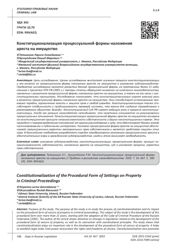 Цель исследования. Целью исследования выступает изучение процесса конституционализации и его влияния на процессуальную форму наложения ареста на имущество в уголовном судопроизводстве. Предметом исследования является развитие данной процессуальной формы на протяжении более 21 года, начиная с принятия УПК РФ (2001 г.). Авторы статьи обращают внимание на изменения законодательства, связанные с развитием процессуальной формы наложения ареста на имущество, а также на его связь с конституционными принципами. Исследование показывает, что конституционализация играет важную роль в развитии процессуальной формы наложения ареста на имущество. Она способствует установлению правового порядка, ограничению власти и защите прав и свобод граждан. Конституционализация также способствует стабильности и предсказуемости правовой системы, что важно для создания справедливого и равноправного общества. Выводы. Конституционный Суд РФ играет ведущую роль в процессе конституционализации, тогда как реакция законодателя запаздывает, что негативно сказывается на регулировании процессуальных отношений. Конституционализация процессуальной формы ареста на имущество основана на конституционном принципе неприкосновенности собственности и других конституционных нормах. Это приводит к перераспределению полномочий от органа расследования к суду, что обеспечивает баланс между частноправовыми и публичными интересами. Уголовно-процессуальная форма ареста на имущество обеспечивает процессуальные гарантии материальных прав собственников и является средством защиты этих прав. В дальнейшем необходимо разработать порядок преобразования уголовного-процессуального ареста в обеспечительные меры в гражданском судопроизводстве, когда в этом возникает необходимость.