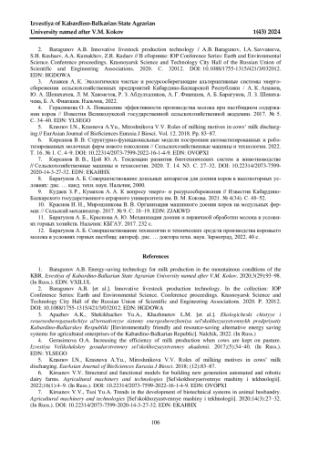 2. Baragunov A.B. Innovative livestock production technology / A.B. Baragunov, I.A. Savvateeva, S.H. Kushaev, A.A. Kumakhov, Z.R. Kudaev // В сборнике: IOP Conference Series: Earth and Environmental Science. Conference proceedings. Krasnoyarsk Science and Technology City Hall of the Russian Union of Scientific and Engineering Associations. 2020. С. 32012. DOI: 10.1088/1755-1315/421/3/032012 EDN: HGDOWA