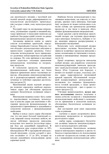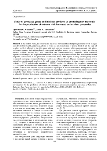 Статья: ИССЛЕДОВАНИЕ ПРОДУКТОВ ПЕРЕРАБОТКИ ВИНОГРАДА И ГИБИСКУСА КАК ПЕРСПЕКТИВНОГО СЫРЬЯ ДЛЯ ПРОИЗВОДСТВА ЭКСТРАКТОВ С ПОВЫШЕННЫМИ АНТИОКСИДАНТНЫМИ СВОЙСТВАМИ (2024)