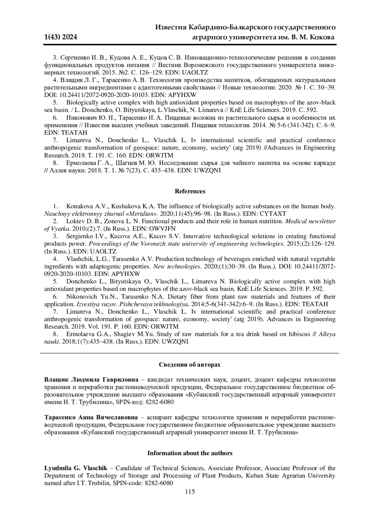 ВЛАЩИК Л. Г., ТАРАСЕНКО А. В. ИССЛЕДОВАНИЕ ПРОДУКТОВ ПЕРЕРАБОТКИ ВИНОГРАДА И ГИБИСКУСА КАК ПЕРСПЕКТИВНОГО СЫРЬЯ ДЛЯ ПРОИЗВОДСТВА ЭКСТРАКТОВ С ПОВЫШЕННЫМИ АНТИОКСИДАНТНЫМИ СВОЙСТВАМИ // ИЗВЕСТИЯ КАБАРДИНО-БАЛКАРСКОГО ГОСУДАРСТВЕННОГО АГРАРНОГО УНИВЕРСИТЕТА ИМ. В. М. КОКОВА. 2024. № 1 (43)