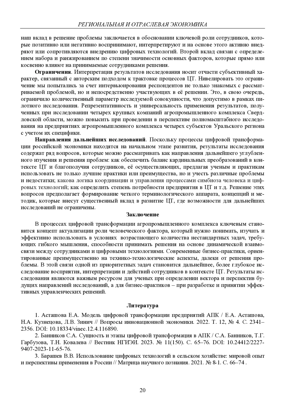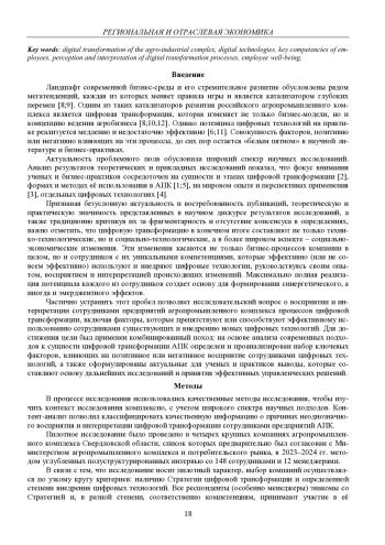 Ключевые фразы: цифровая трансформация агропромышленного комплекса, цифровые технологии, ключевые компетенции сотрудников, восприятие и интерпретация процессов цифровой трансформации, БЛАГОПОЛУЧИЕ СОТРУДНИКОВ