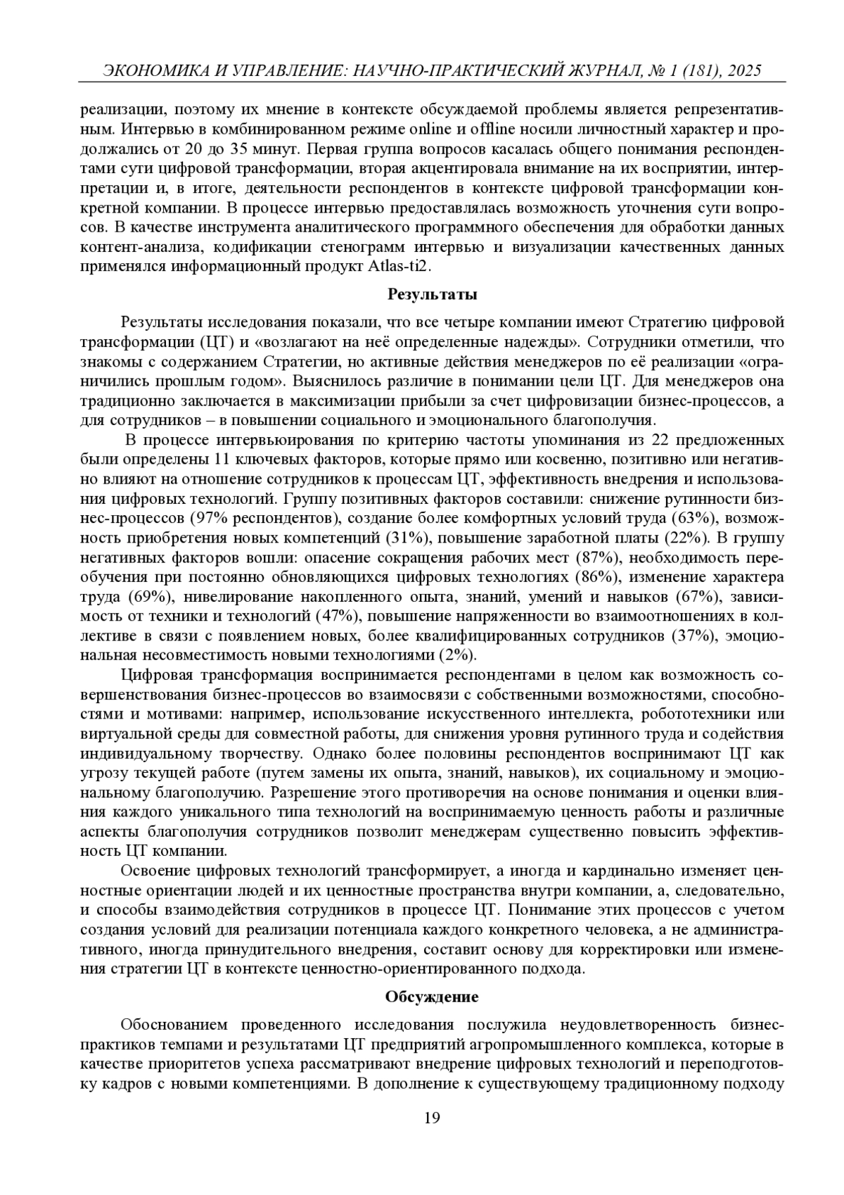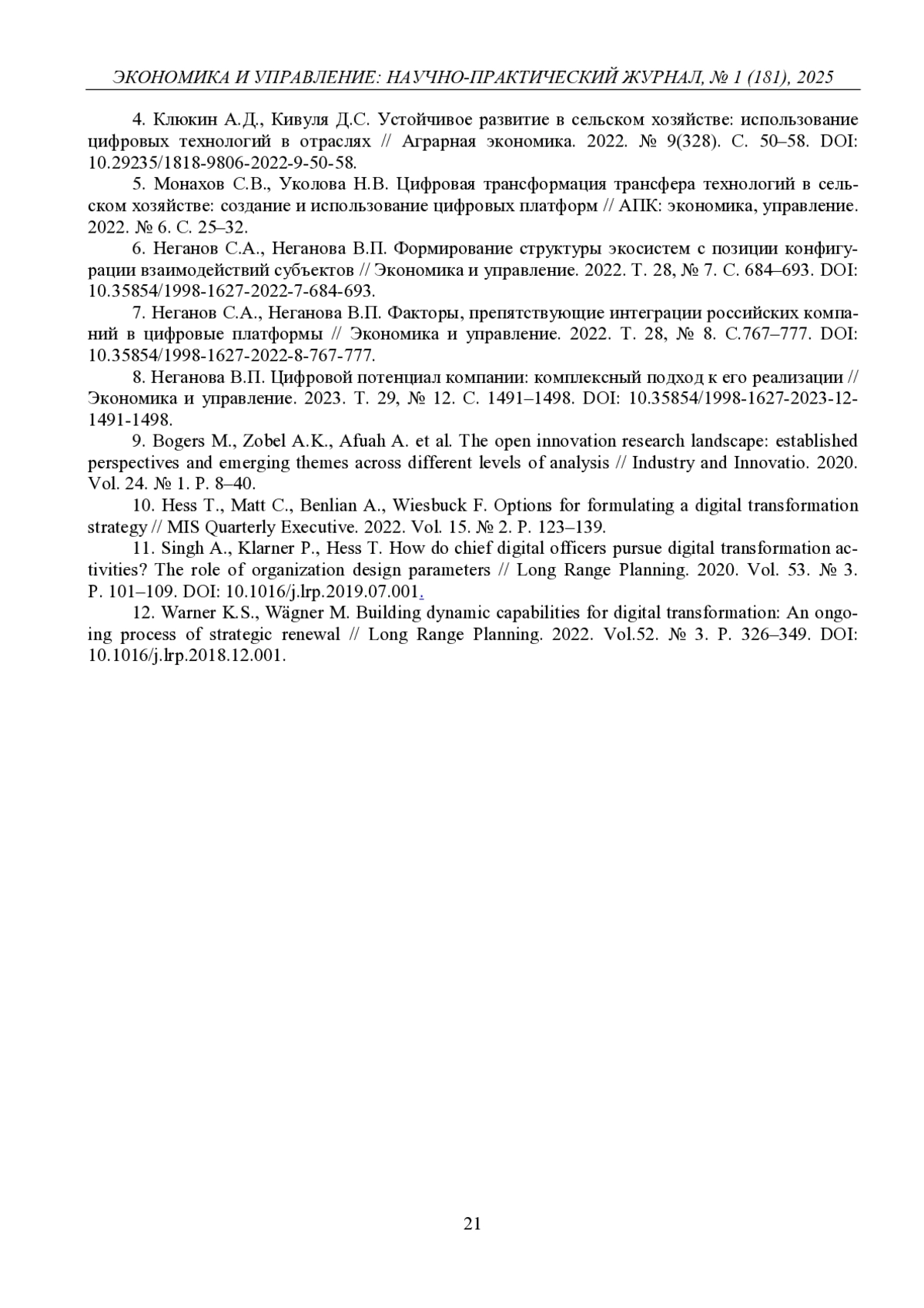 НЕГАНОВА В. П. КЛЮЧЕВЫЕ ДЕТЕРМИНАНТЫ ЦИФРОВОЙ ТРАНСФОРМАЦИИ АГРОПРОМЫШЛЕННОГО КОМПЛЕКСА: ЧЕЛОВЕЧЕСКИЙ ФАКТОР // ЭКОНОМИКА И УПРАВЛЕНИЕ: НАУЧНО-ПРАКТИЧЕСКИЙ ЖУРНАЛ. 2025. № 1 (181)