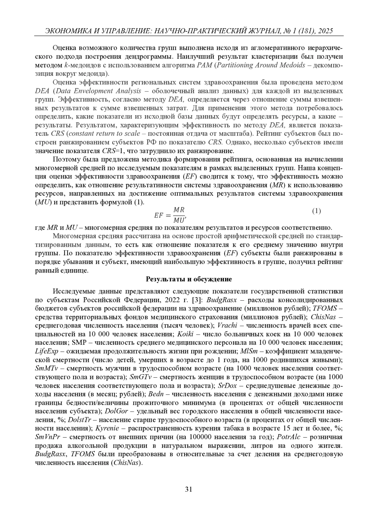 БОЧЕНИНА М. В., КУРГИНА С. М., МУЗАЛЕВСКАЯ С. А., ЯНГИРОВ Т. А. ЭФФЕКТИВНОСТЬ РЕГИОНАЛЬНОЙ СИСТЕМЫ ЗДРАВООХРАНЕНИЯ: РЕЙТИНГ СУБЪЕКТОВ РОССИЙСКОЙ ФЕДЕРАЦИИ // ЭКОНОМИКА И УПРАВЛЕНИЕ: НАУЧНО-ПРАКТИЧЕСКИЙ ЖУРНАЛ. 2025. № 1 (181)