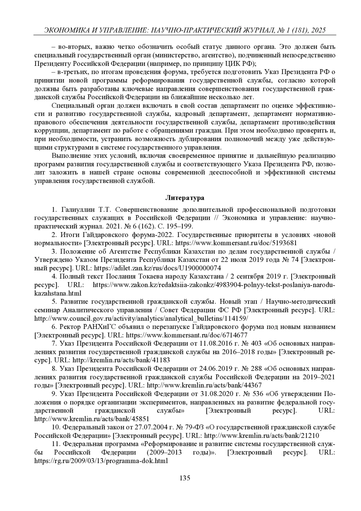 1. 	Галиуллин Т.Т. Совершенствование дополнительной профессиональной подготовки государственных служащих в Российской Федерации // Экономика и управление: научно-практический журнал. 2021. № 6 (162). С. 195-199.