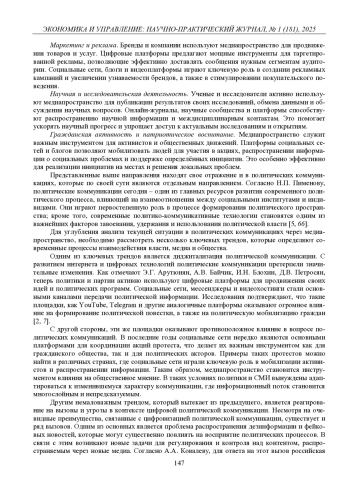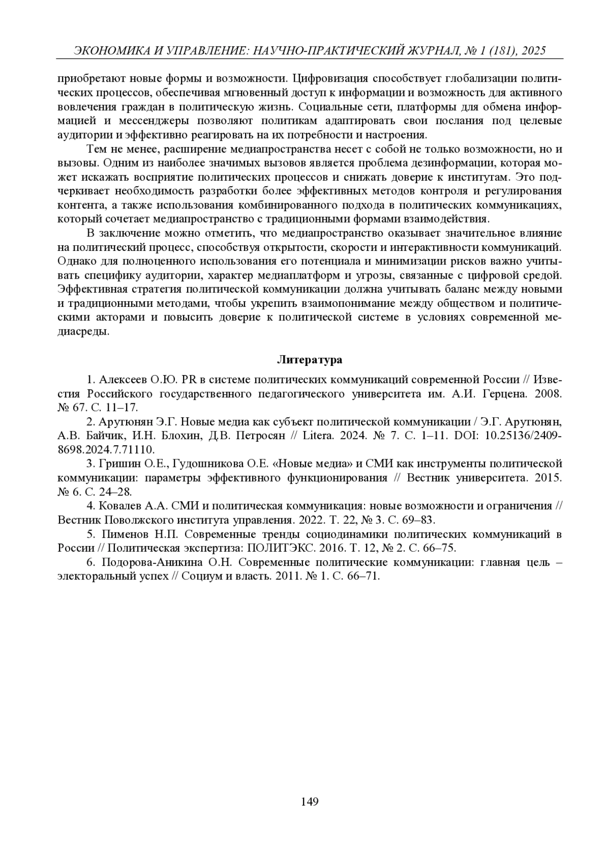 ФАРХУТДИНОВА И. Р., САБИТОВ Г. Р. МЕДИАПРОСТРАНСТВА И ПОЛИТИЧЕСКИЕ КОММУНИКАЦИИ: КАНАЛЫ ВЗАИМОДЕЙСТВИЯ // ЭКОНОМИКА И УПРАВЛЕНИЕ: НАУЧНО-ПРАКТИЧЕСКИЙ ЖУРНАЛ. 2025. № 1 (181)