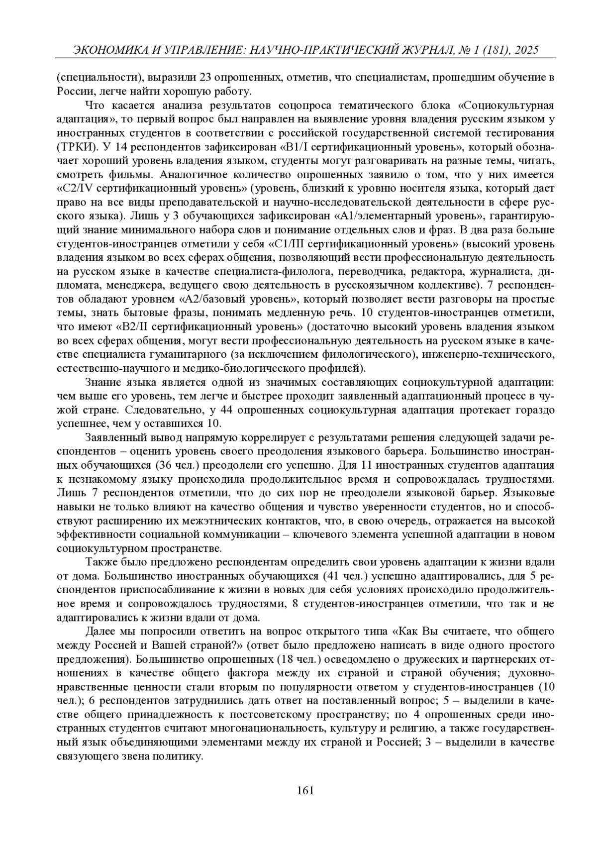 ВАГАПОВ Р. Р., ВАН Ц. УПРАВЛЕНИЕ СОЦИОКУЛЬТУРНОЙ АДАПТАЦИЕЙ ИНОСТРАННЫХ СТУДЕНТОВ: ОПЫТ УФИМСКОГО УНИВЕРСИТЕТА НАУКИ И ТЕХНОЛОГИЙ // ЭКОНОМИКА И УПРАВЛЕНИЕ: НАУЧНО-ПРАКТИЧЕСКИЙ ЖУРНАЛ. 2025. № 1 (181)