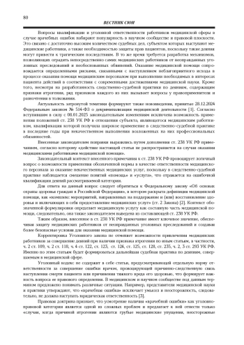 Вопросы квалификации и уголовной ответственности работников медицинской сферы в случае врачебных ошибок набирают популярность в научном сообществе и правовой плоскости. Это связано с достаточно высоким количеством судебных дел, субъектом которых выступают медицинские работники, а также необходимостью защиты прав пациентов, поскольку такие деяния могут привести к трагическим последствиям.