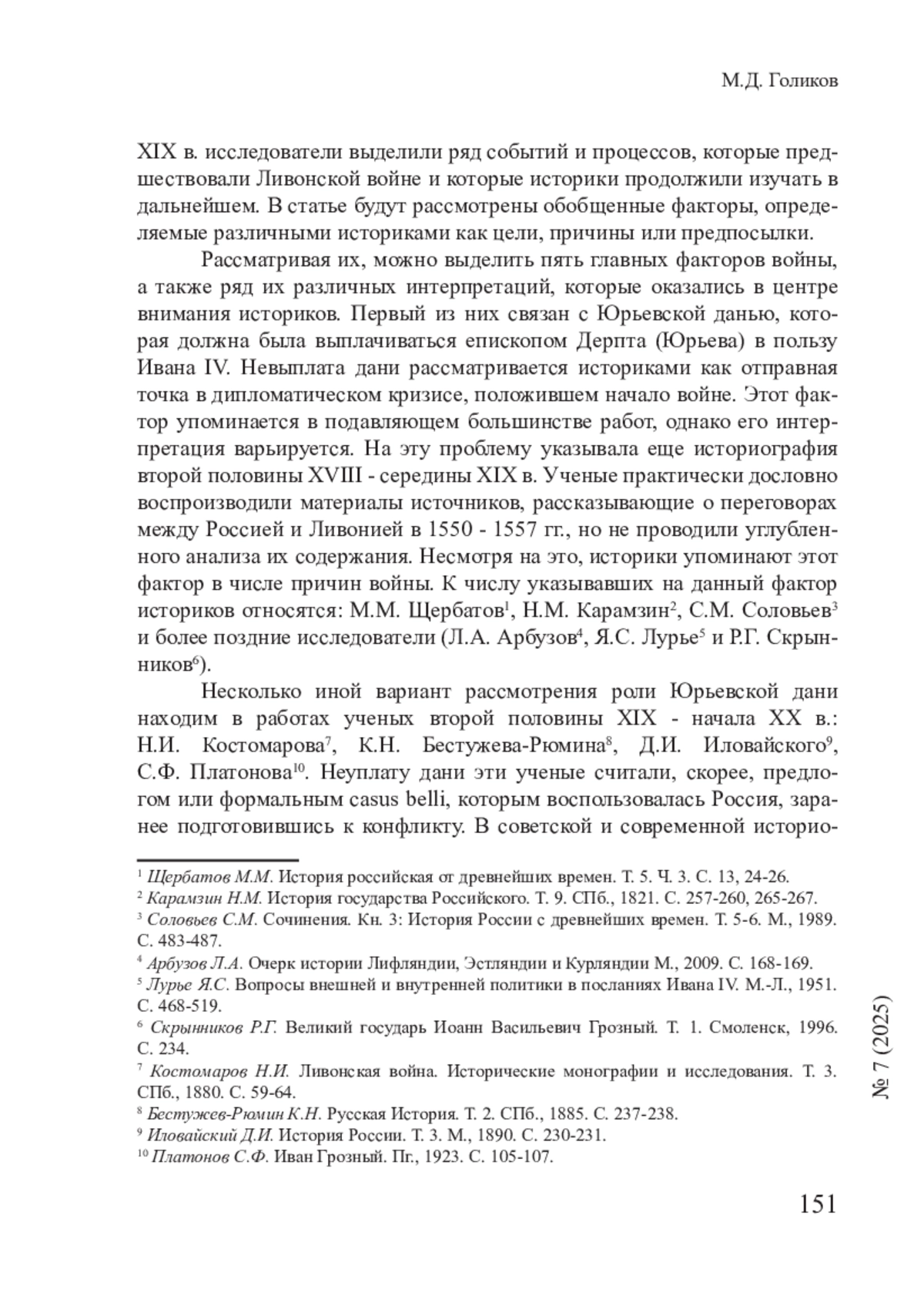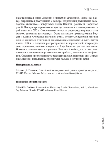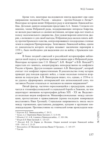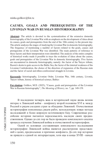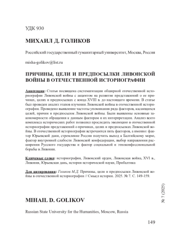 ГОЛИКОВ М. Д. ПРИЧИНЫ, ЦЕЛИ И ПРЕДПОСЫЛКИ ЛИВОНСКОЙ ВОЙНЫ В ОТЕЧЕСТВЕННОЙ ИСТОРИОГРАФИИ // СМЫСЛ ИСТОРИИ. 2025. № 7