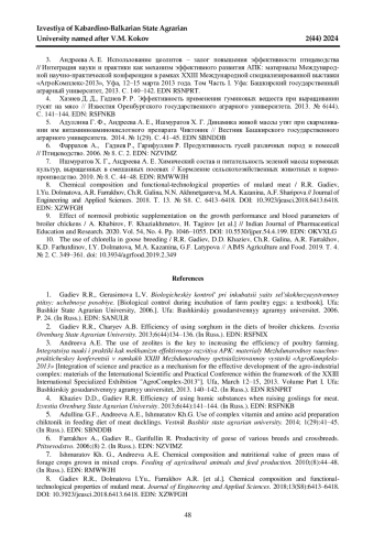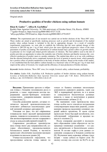 ГАДИЕВ Р. Р., ГАЙФУЛЛИНА А. Р. ПРОДУКТИВНЫЕ КАЧЕСТВА ЦЫПЛЯТ-БРОЙЛЕРОВ ПРИ ИСПОЛЬЗОВАНИИ ГУМАТА НАТРИЯ // ИЗВЕСТИЯ КАБАРДИНО-БАЛКАРСКОГО ГОСУДАРСТВЕННОГО АГРАРНОГО УНИВЕРСИТЕТА ИМ. В. М. КОКОВА. 2024. № 2 (44)