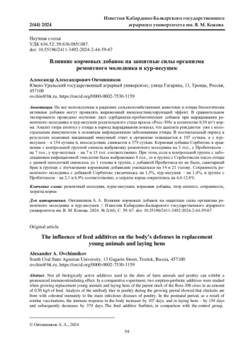 Статья: ВЛИЯНИЕ КОРМОВЫХ ДОБАВОК НА ЗАЩИТНЫЕ СИЛЫ ОРГАНИЗМА РЕМОНТНОГО МОЛОДНЯКА И КУР-НЕСУШЕК (2024)