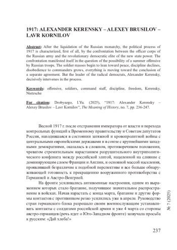 После ликвидации российской монархии политический процесс 1917 г. характеризуется, прежде всего, противостоянием между офицерским корпусом российской армии и революционной демократической элитой пришедшей государственной власти. Противостояние проявилось в вопросе о возможности летнего наступления российских войск. Солдатская масса начинает склоняться к миру, падает дисциплина, нарастает неповиновение командирам, все идет к заключению сепаратного соглашения. Но в процесс решительно вмешивается лидер радикальных демократов Александр Керенский.