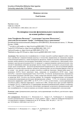 При производстве полуфабрикатов и готовых изделий из рыбных фаршей особую значимость приобретает совершенствование рецептур и технологий, направленных на повышение пищевой и биологической ценности, а также безопасности продуктов. Одним из способов повышения функциональных свойств является использование биоактивных пептидов в совокупности с фенольными соединениями и другими растительными БАД, что приводит к совершенствованию органолептических показателей. К важнейшим свойствам продукции многие ученые относят доступность для различных социальных групп потребителей - продуктов функциональной направленности. Для исследований выбраны наиболее доступные объекты морского промысла, рекомендуемые для изготовления фаршей и блюд на их основе - хек, минтай и треска, которые относятся к семейству тресковых. Данные рыбы имеют обводненную (0,82%) белую мышечную ткань, уникальны по калорийности (69-86 ккал), тощие (0,6-0,9%) с высокой концентрацией белка (16,0-19,0%). В качестве функциональных ингредиентов использованы ячменная и рисовая мука, а также в рецептуры введены овощи и специи. Контролем была рецептура №541. Котлеты или биточки рыбные. На основании экспериментальных исследований установлены концентрации растительных функциональных добавок - 5-15%, что позволило увеличить предельное напряжение сдвига (ПНС) на 10,7%, 8,7% и 12,2% соответственно, а влагоудерживающая способность (ВУС) образцов коррелирует с нежностью и ПНС. Потери массы при тепловой обработке составляют 20-21%, в зависимости от концентрации вводимой функциональной добавки в концентрации 5-10%. Разработанная технология обеспечивает расширение ассортимента функциональных рыбных полуфабрикатов, что является важным для питания социально незащищенных слоев населения.
