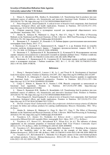 11. Васюкова А. Т., Кривошонок К. В., Сидоренко Ю. И. Биогенные амины в рыбных полуфабрикатах и кулинарных изделиях // Рыбное хозяйство. 2022. № 1. С. 95-102. 10.37663/0131-6184- 2022-1-95-102. DOI: 10.37663/0131-6184-2022-1-95-102 EDN: FYHCTL