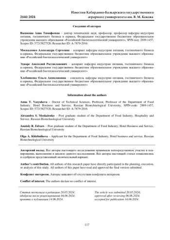 9. Васюкова А. Т., Кусова И. У., Кривошонок К. В., Эдварс Р. А. и др. Влияние БАД на потребительские свойства функционального фарша // Товаровед продовольственных товаров. 2022. № 3. С. 174-179. DOI: 10.33920/igt-01-2203-03 EDN: RTRWEI