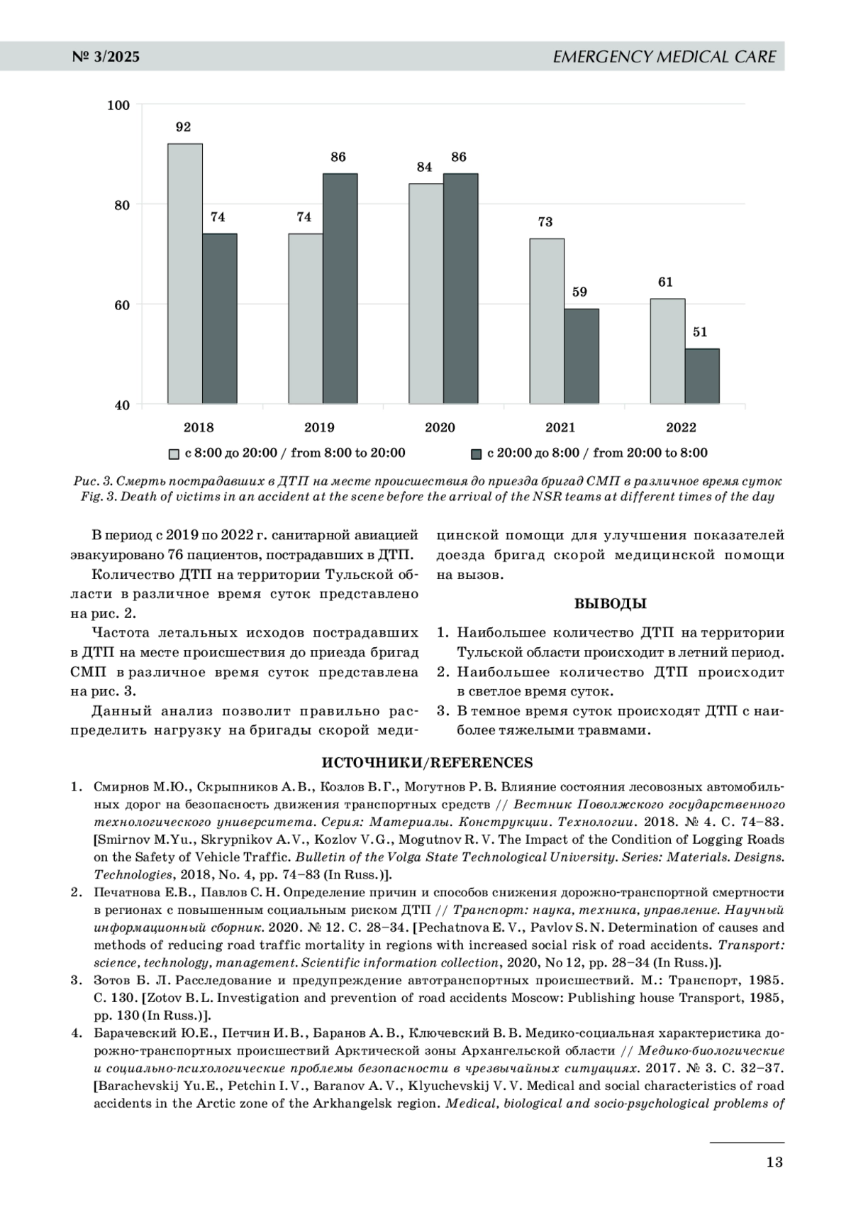 4. Барачевский Ю.Е., Петчин И. В., Баранов А. В., Ключевский В. В. Медико-социальная характеристика дорожно-транспортных происшествий Арктической зоны Архангельской области // Медико-биологические и социально-психологические проблемы безопасности в чрезвычайных ситуациях. 2017. № 3. C. 32-37.