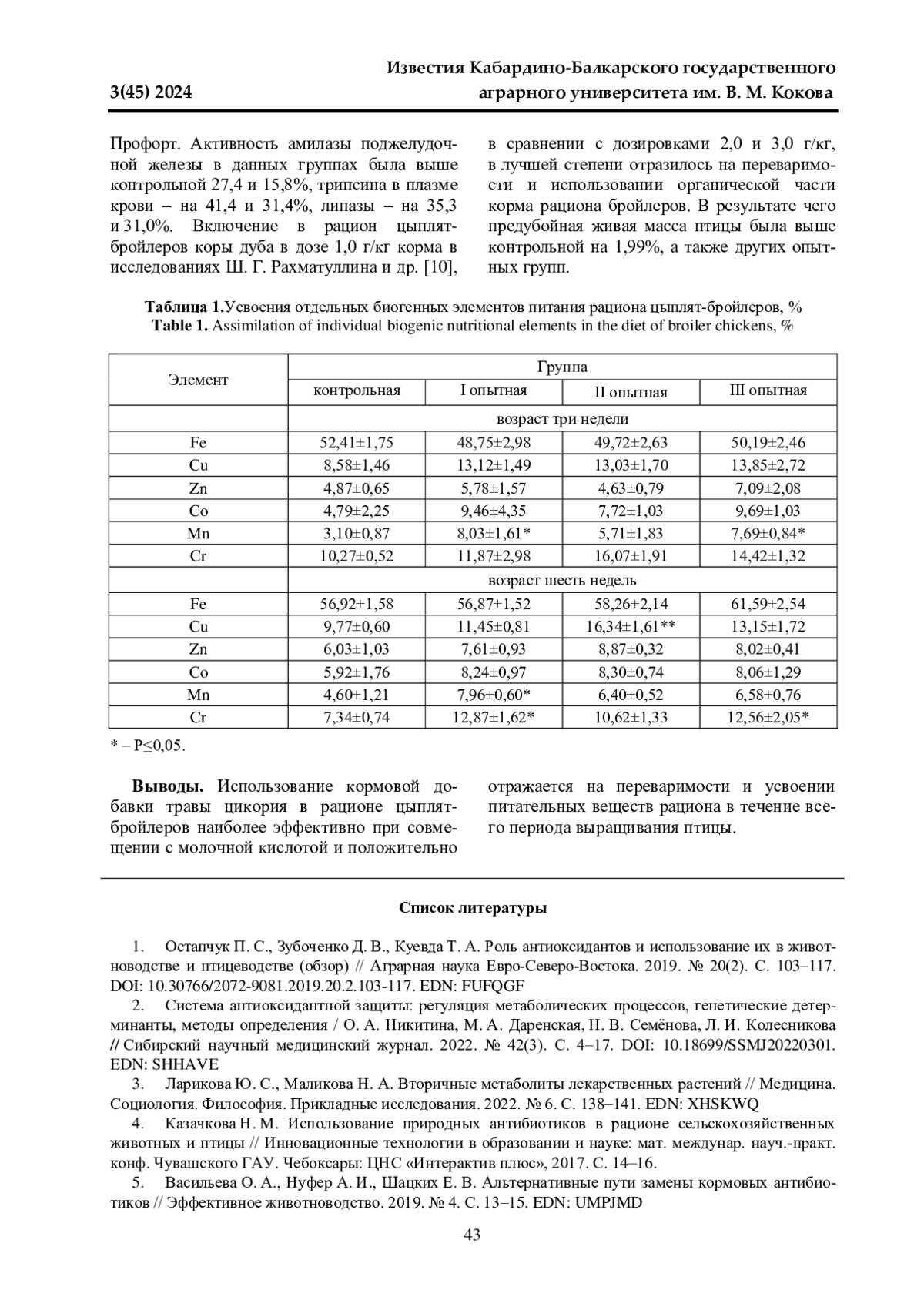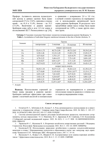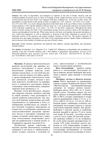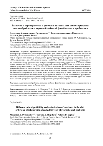 Статья: РАЗЛИЧИЕ В ПЕРЕВАРИМОСТИ И УСВОЕНИИ ПИТАТЕЛЬНЫХ ВЕЩЕСТВ РАЦИОНА ЦЫПЛЯТ-БРОЙЛЕРОВ С КОРМОВОЙ ДОБАВКОЙ ФИТОБИОТИКА И ПРЕБИОТИКА (2024)