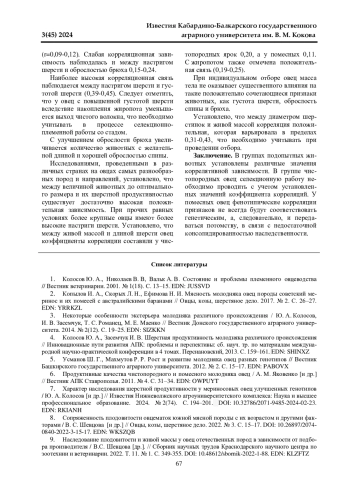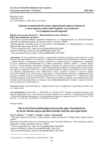 КОЛОСОВ Ю. А., АБОНЕЕВ В. В., ЗАСЕМЧУК И. В. УРОВЕНЬ ВЗАИМОСВЯЗЕЙ МЕЖДУ ПРИЗНАКАМИ ПРОДУКТИВНОСТИ У ОВЕЦ ПОРОДЫ СОВЕТСКИЙ МЕРИНОС И ИХ ПОМЕСЕЙ СО СТАВРОПОЛЬСКОЙ ПОРОДОЙ // ИЗВЕСТИЯ КАБАРДИНО-БАЛКАРСКОГО ГОСУДАРСТВЕННОГО АГРАРНОГО УНИВЕРСИТЕТА ИМ. В. М. КОКОВА. 2024. № 3 (45)