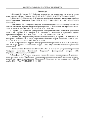 1. Гулина С.Т., Мусина Д.Р. Цифровое неравенство как препятствие для развития регионов и отраслей // Human Progress. 2024. Т. 10. № 5. С. 6. DOI: 10.46320/2073-4506-2024-5a-5 EDN: MQTXKL