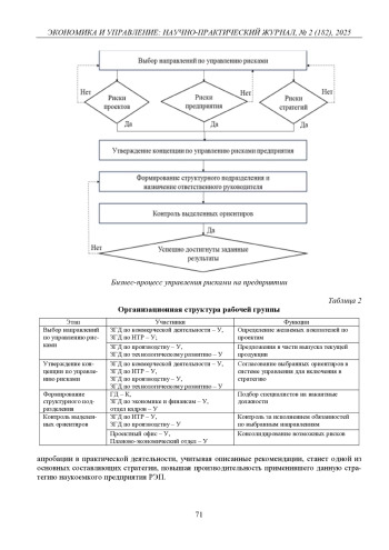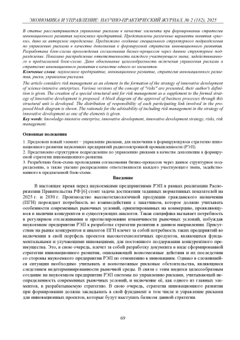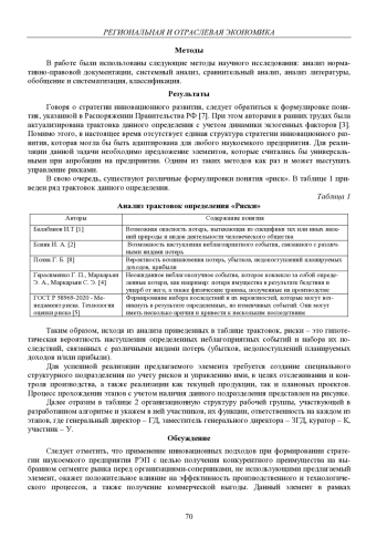 В статье рассматривается управление рисками в качестве элемента при формировании стратегии инновационного развития наукоемких предприятий. Представлены различные варианты понятия «риски», дано их авторское определение. Предложено создание специального структурного подразделения по управлению рисками в качестве дополнения к формируемой стратегии инновационного развития. Разработана блок-схема прохождения согласования бизнес-процессов через данное структурное подразделение. Показано распределение ответственности каждого участвующего звена, задействованного в предлагаемой блок-схеме. Дано обоснование целесообразности включения управления рисками в стратегию инновационного развития в качестве одного из элементов