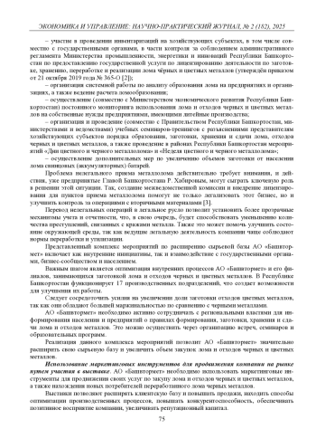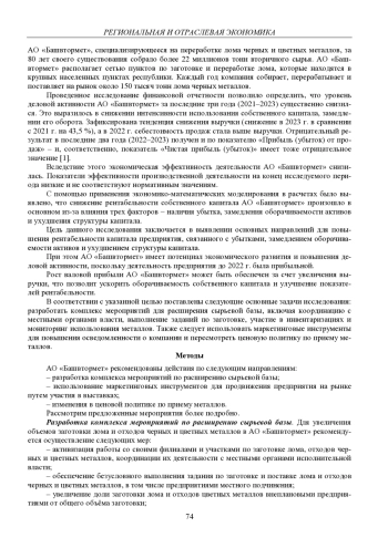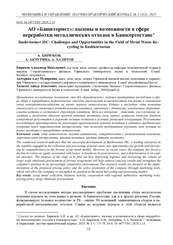 Проведенное исследование указывает, что АО «Башвтормет», ведущее предприятие республики в сфере сбора и переработки металлических отходов, располагает возможностями для роста и повышения своей конкурентоспособности на рынке черного металлолома. Однако в последние годы компания столкнулась со снижением рентабельности капитала, связанным с убытками, замедлением оборачиваемости активов и ухудшением структуры капитала. Цель исследования – выяснить, как улучшение логистики и увеличение объемов крупной оптовой заготовки лома черных металлов помогут достичь конкретных результатов и укрепить позиции компании в условиях растущей конкуренции. Результаты исследования ориентированы на реализацию предложенной ценовой политики и активное продвижение компании через маркетинговые инструменты, что позволит предприятию укрепить свои позиции на рынке заготовки и переработки металлолома