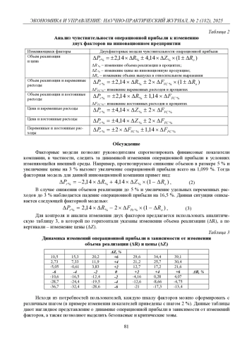 В статье рассмотрен анализ чувствительности операционной прибыли к изменению двух факторов, который может быть использован для анализа последствий управленческих решений и позволит спрогнозировать варианты развития негативных ситуаций.