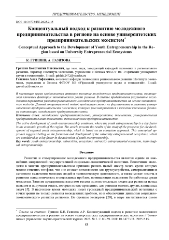 В настоящее время продолжается активное развитие молодежного предпринимательства, являющегося ключевым фактором экономического роста региона. В статье представлены результаты исследования перспектив развития регионального молодежного предпринимательства на основе экосистемного подхода. Данный концептуальный подход предлагает ставку на формирование и развитие университетских предпринимательских экосистем, которые рассматриваются в качестве ключевого фактора активизации молодежного предпринимательства