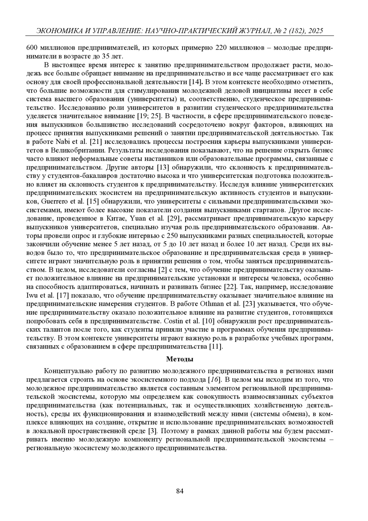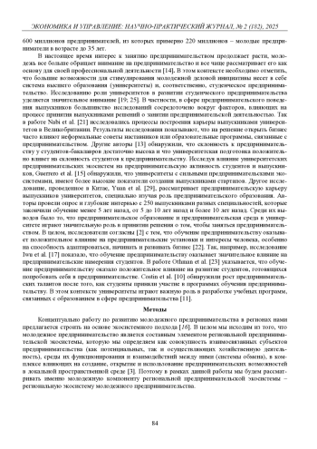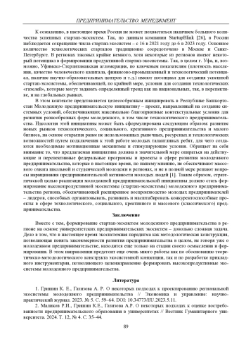 1. Гришин К. Е., Газизова А. Р. О некоторых подходах к проектированию региональной экосистемы молодежного предпринимательства // Экономика и управление: научно-практический журнал. 2023. № 5. С. 59-64. DOI: 10.34773/EU.2023.5.11