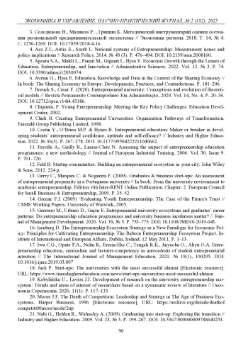 19. Kobylińska U., Lavios J.J. Development of research on the university entrepreneurship ecosystem: Trends and areas of interest of researchers based on a systematic review of literature // Oeconomia Copernicana. 2020. 11(1). P. 117-133.
