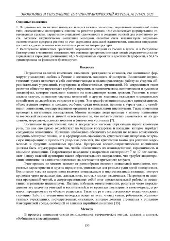 Патриотизм является ключевым элементом гражданского сознания, его воспитание формирует у молодежи любовь к Родине и готовность защищать её интересы. Воспитание патриотических чувств включает в себя систематическую и целенаправленную работу со стороны образовательных учреждений, государства и общественных организаций. На современном этапе развития общество переживает глубокие перемены в экономическом, политическом и духовном ландшафтах, которые оказывают влияние на повседневную жизнь граждан. Различия в социальном статусе, изменение системы ценностей и другие элементы оказывают отрицательное воздействие на людей всех возрастов в стране. Эти трансформации подрывают приверженность общественным нормам и идеалам, особенно среди молодежи, приводя к утрате связи с семейными ценностями, государственными органами и социальными институтами. Такие изменения приводят к негативным последствиям. Многие молодые люди приходят к новому пониманию человеческой ценности и личной ответственности, что неблагоприятно сказывается на их духовном, моральном, психологическом и физическом состоянии