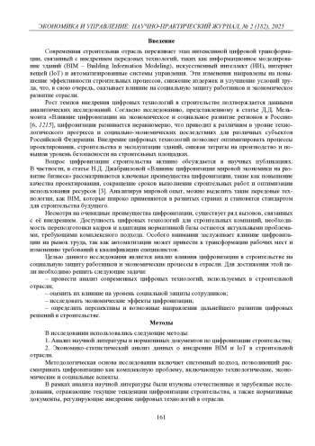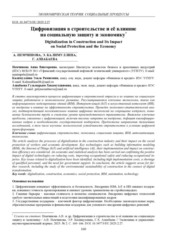 В статье анализируются процессы цифровизации в строительной отрасли и их влияние на социальную защиту работников и экономическое развитие. Рассматриваются ключевые технологии, такие как информационное моделирование зданий (BIM), Интернет вещей (IoT) и искусственный интеллект (ИИ), их внедрение и влияние на эффективность строительства. Проведен экономико-статистический анализ, подтверждающий положительное влияние цифровых технологий на сокращение издержек, повышение безопасности труда и снижение уровня производственного травматизма. Выявлены ключевые проблемы, связанные с цифровизацией, включая высокие затраты на внедрение, дефицит квалифицированных кадров и необходимость государственной поддержки. Предложены направления дальнейших исследований, в том числе изучение экологической устойчивости строительства в условиях цифровой трансформации