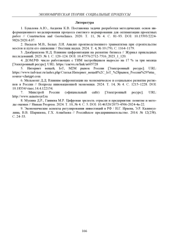 1. Букалова А.Ю., Авдеева К.В. Постановка задачи разработки методических основ информационного моделирования процесса сметного нормирования для оптимизации проектных работ // Construction and Geotechnics. 2020. Т. 11, № 4. С. 81-93. DOI: 10.15593/2224-9826/2020.4.07 EDN: WMJGGQ