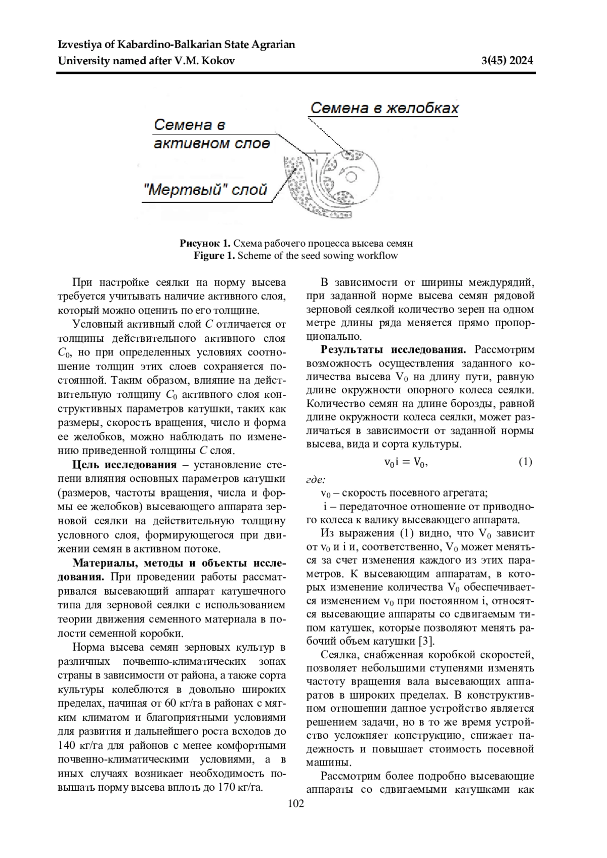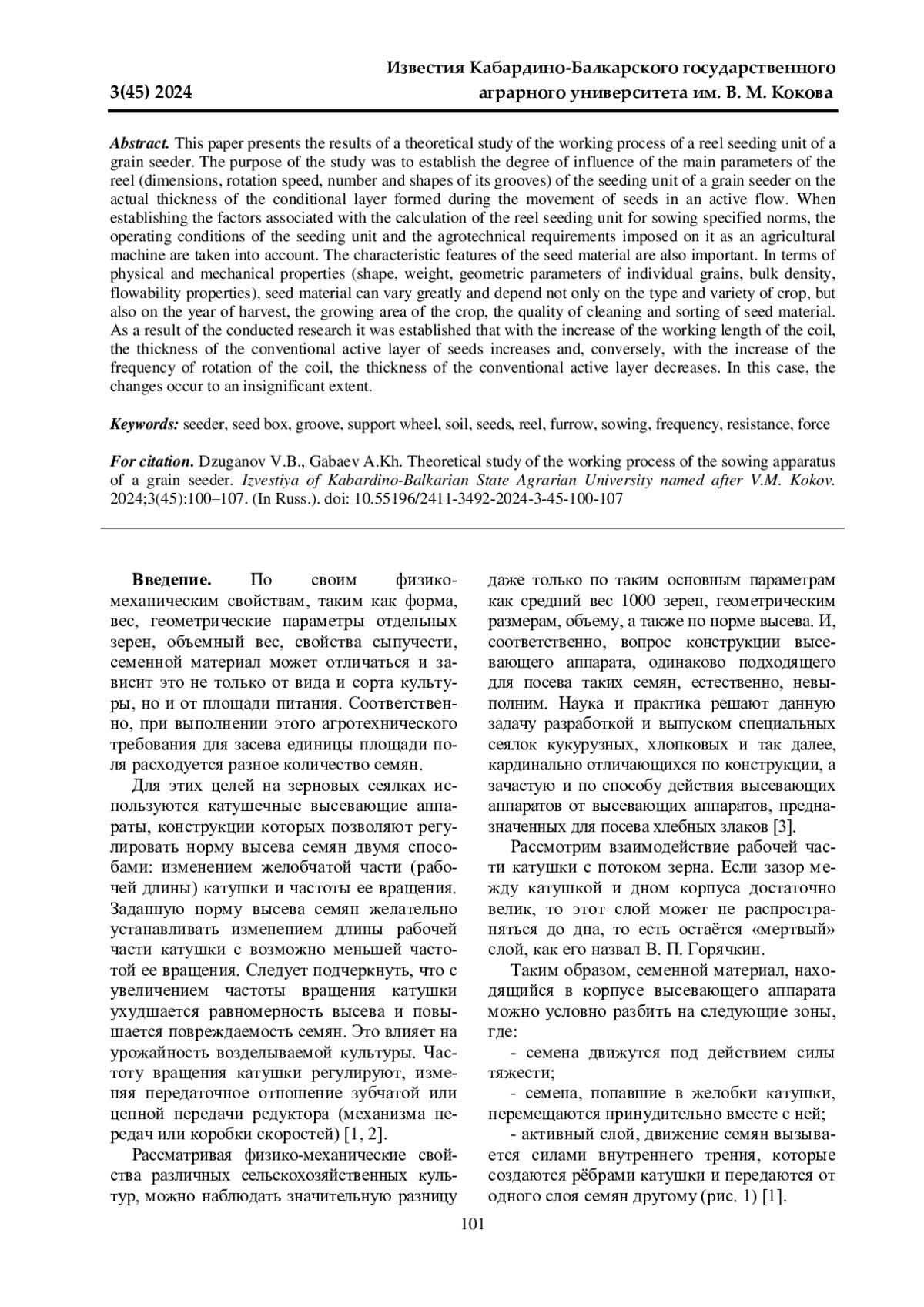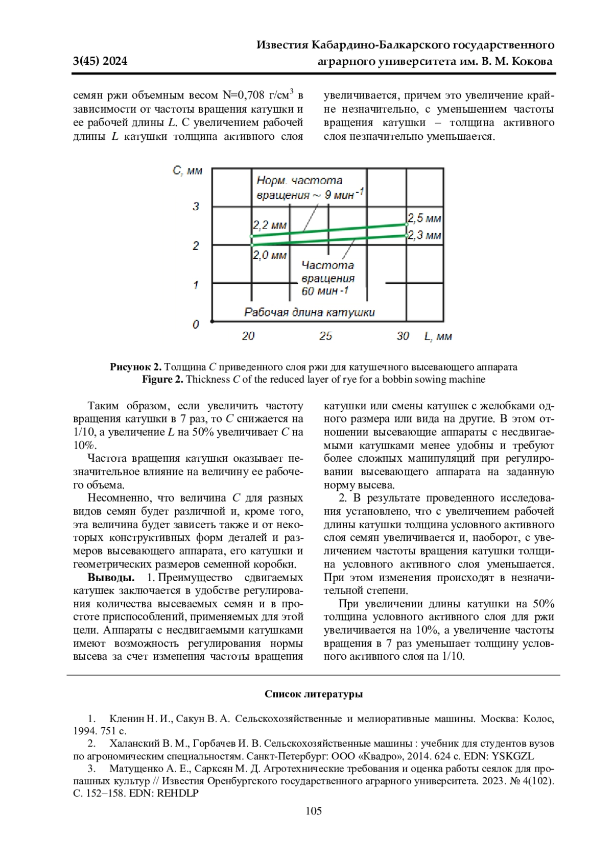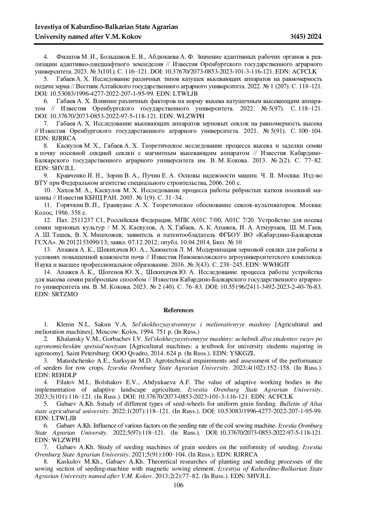6. 	Габаев А. Х. Влияние различных факторов на норму высева катушечным высевающим аппаратом // Известия Оренбургского государственного университета. 2022. № 5(97). С. 118-121. DOI: 10.37670/2073-0853-2022-97-5-118-121 EDN: WLZWPH