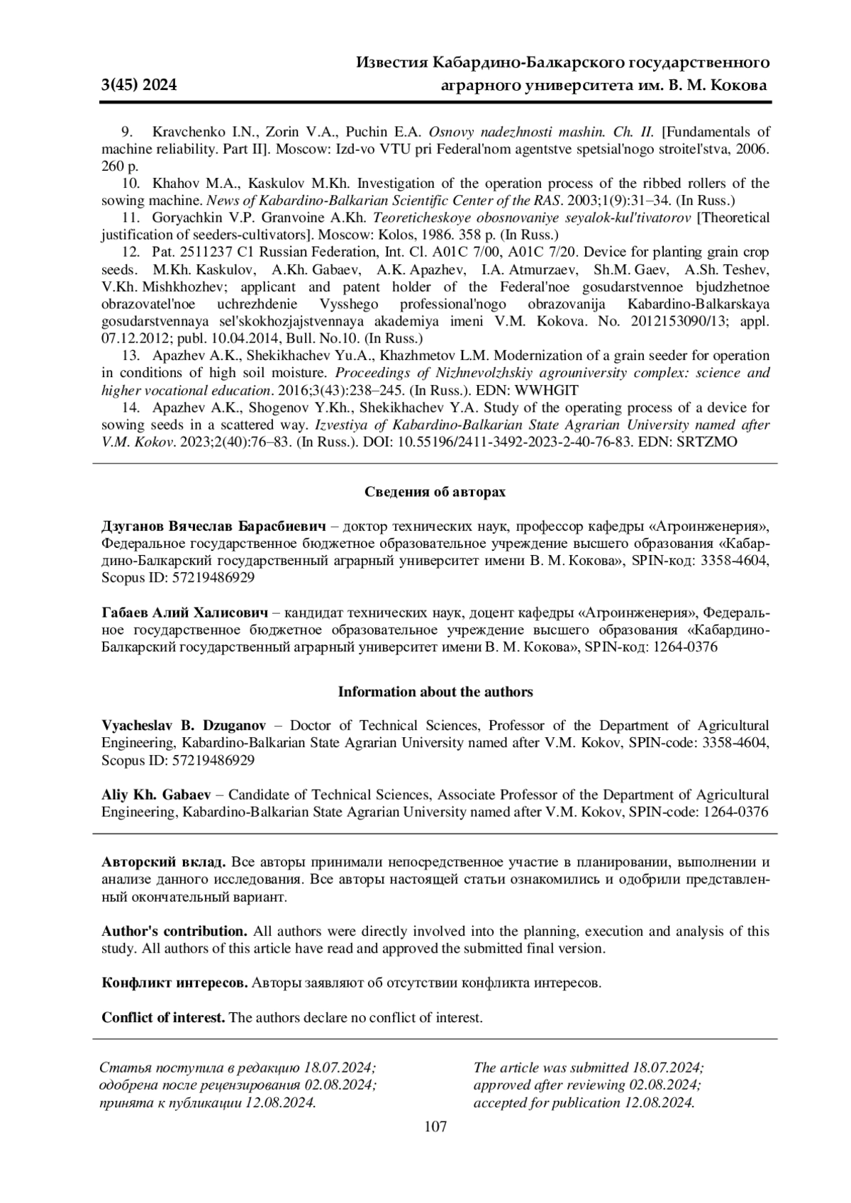 8. 	Каскулов М. Х., Габаев А. Х. Теоретическое исследование процесса высева и заделки семян в почву посевной секцией сеялки с магнитным высевающим аппаратом // Известия Кабардино-Балкарского государственного аграрного университета им. В. М. Кокова. 2013. № 2(2). С. 77-82. EDN: SHVJLL