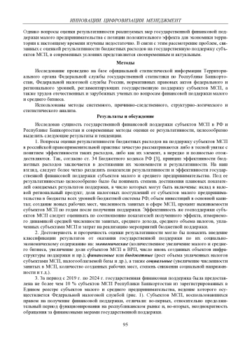 В условиях усилившегося влияния проинфляционных факторов на российскую экономику и предпринимаемых Правительством РФ и Центральным банком РФ мер по обеспечению устойчивости экономического роста усиливается актуальность решения проблемы повышения результативности государственной поддержки субъектов МСП как значимой для развития национальной экономики и одновременно наиболее уязвимой части бизнеса. Низкая защищенность малого и среднего бизнеса особенно заметно проявляется в части влияния высокой инфляции, роста ключевой ставки и, соответственно, процентных ставок по кредитным и депозитным операциям, значительного повышения издержек на производство и реализацию продукции. Актуализация решения проблемы, поставленной в названии статьи, предопределяет цель и задачи исследования настоящей статьи: рассмотрение и развитие теоретических основ оценки результативности современных методов государственной финансовой поддержки МСП и формулирование на этой основе направлений ее повышения для обеспечения не только выживаемости субъектов предпринимательства, но и повышения устойчивости их функционирования, поддержания инновационной и инвестиционной активности в современных условиях