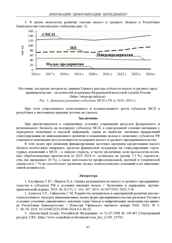 1. 	Алтуфьева Т.Ю., Иванов П.А. Оценка резилиентности малого и среднего предпринимательства в субъектах РФ в условиях внешних шоков // Экономика и управление: научно-практический журнал. 2023. № 5(173). С. 101-107.  DOI: 10.34773/EU.2023.5.18