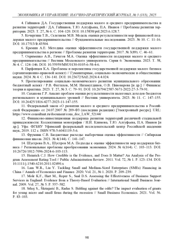 4. 	Гайнанов Д.А. Государственная поддержка малого и среднего предпринимательства и развитие территорий / Д.А. Гайнанов, Т.Ю. Алтуфьева, П.А. Иванов // Проблемы развития территории. 2023. Т. 27, № 6. С. 104-120.  DOI: 10.15838/ptd.2023.6.128.7  EDN: BCENHG