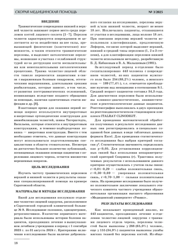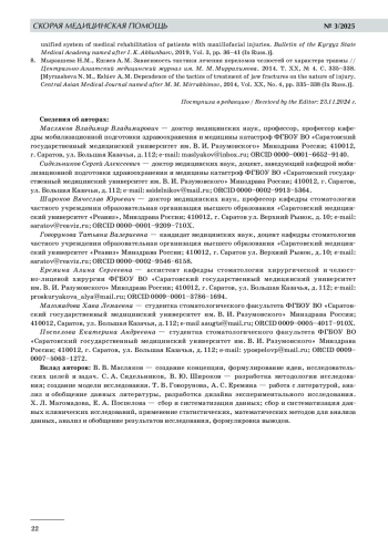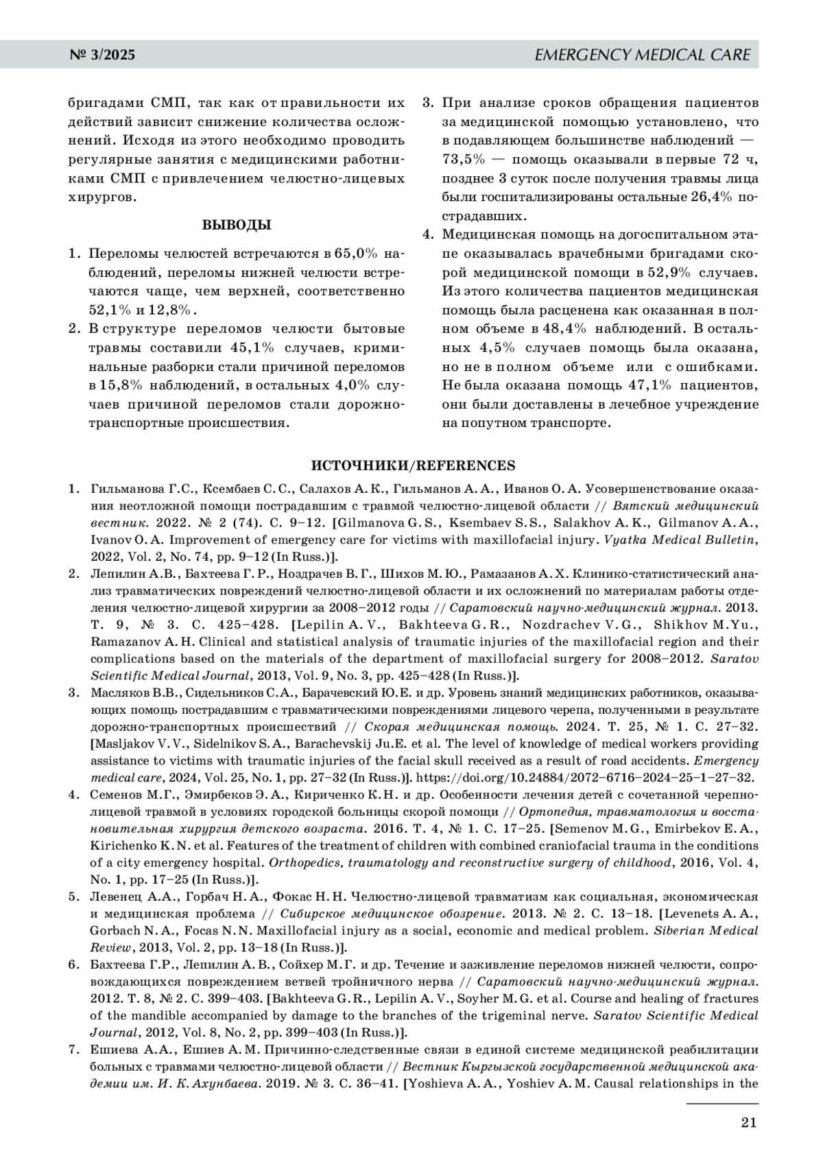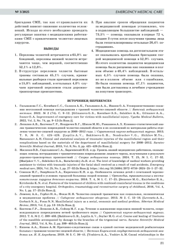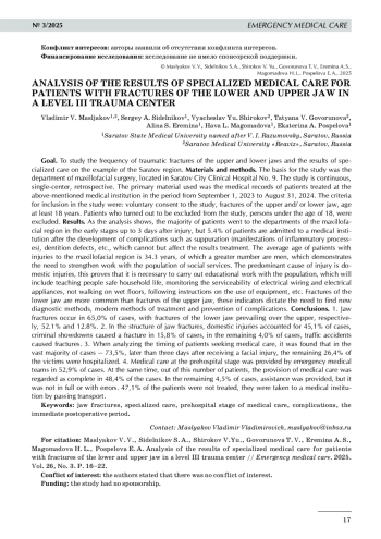 МАСЛЯКОВ В. В., СИДЕЛЬНИКОВ С. А., ШИРОКОВ В. Ю., ГОВОРУНОВА Т. В., ЕРЕМИНА А. С., МАГОМАДОВА Х. Л., ПОСПЕЛОВА Е. А. АНАЛИЗ РЕЗУЛЬТАТОВ ОКАЗАНИЯ СПЕЦИАЛИЗИРОВАННОЙ МЕДИЦИНСКОЙ ПОМОЩИ ПАЦИЕНТАМ С ПЕРЕЛОМОМ НИЖНЕЙ И ВЕРХНЕЙ ЧЕЛЮСТИ В ТРАВМОЦЕНТРЕ III УРОВНЯ // СКОРАЯ МЕДИЦИНСКАЯ ПОМОЩЬ. 2025. № 3, ТОМ 26