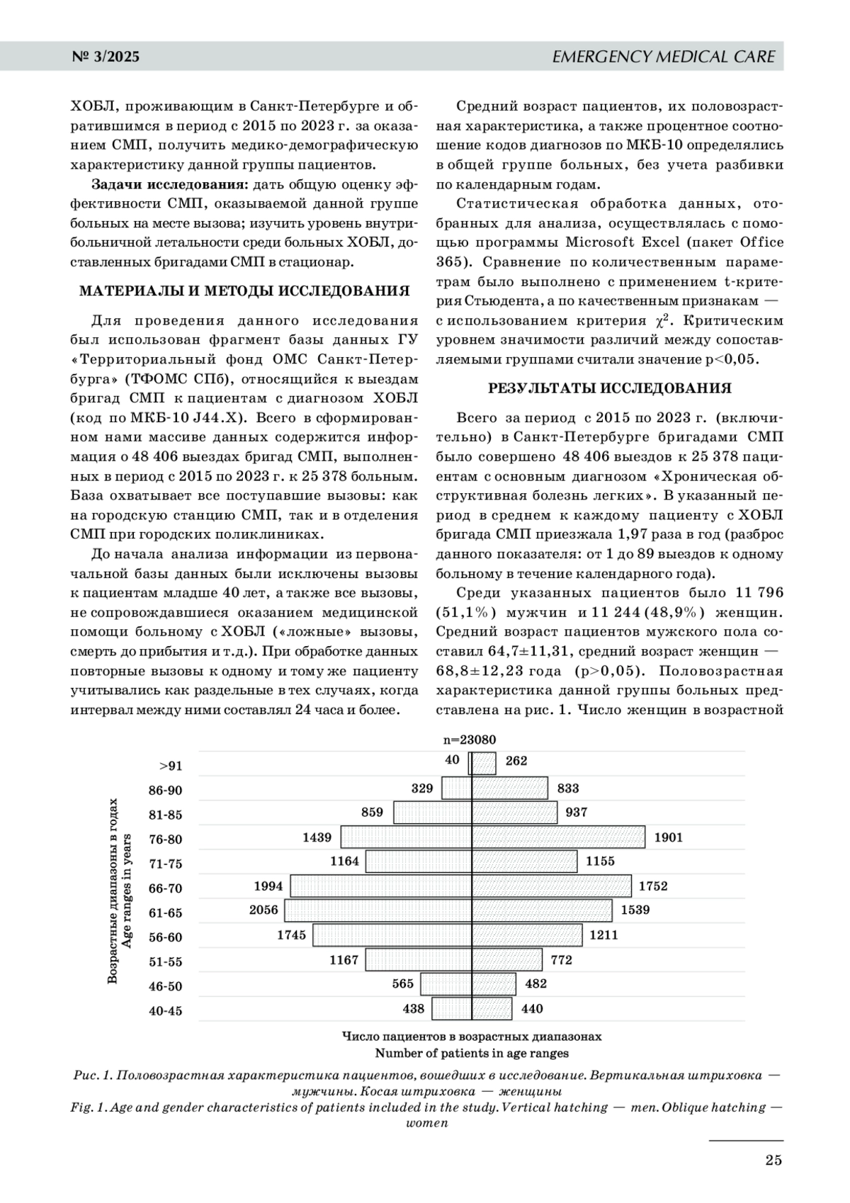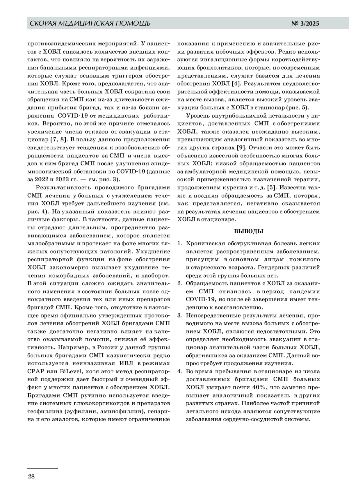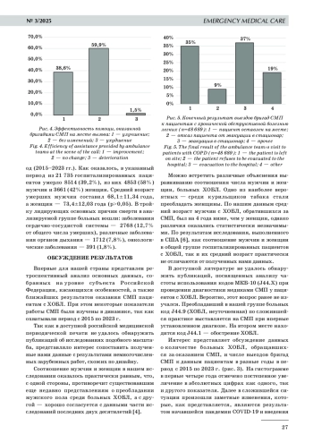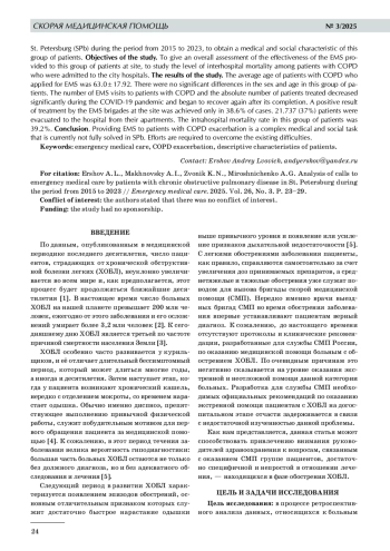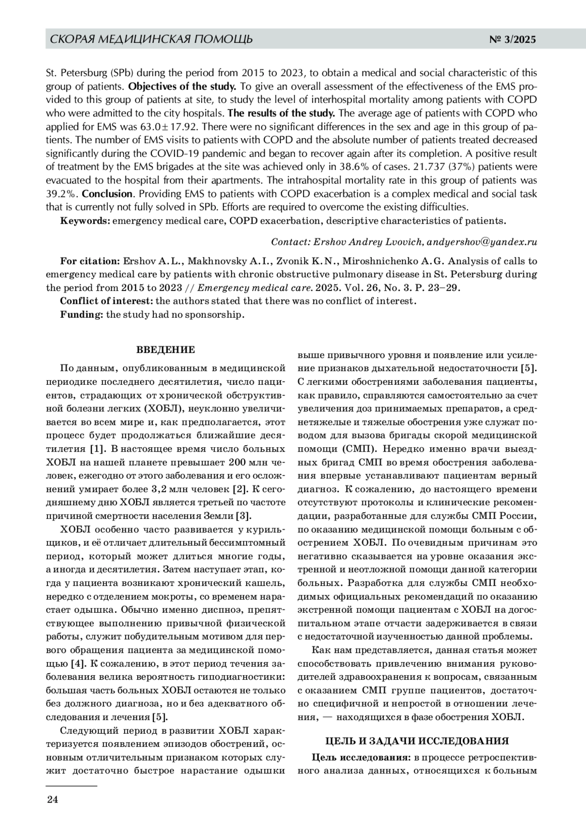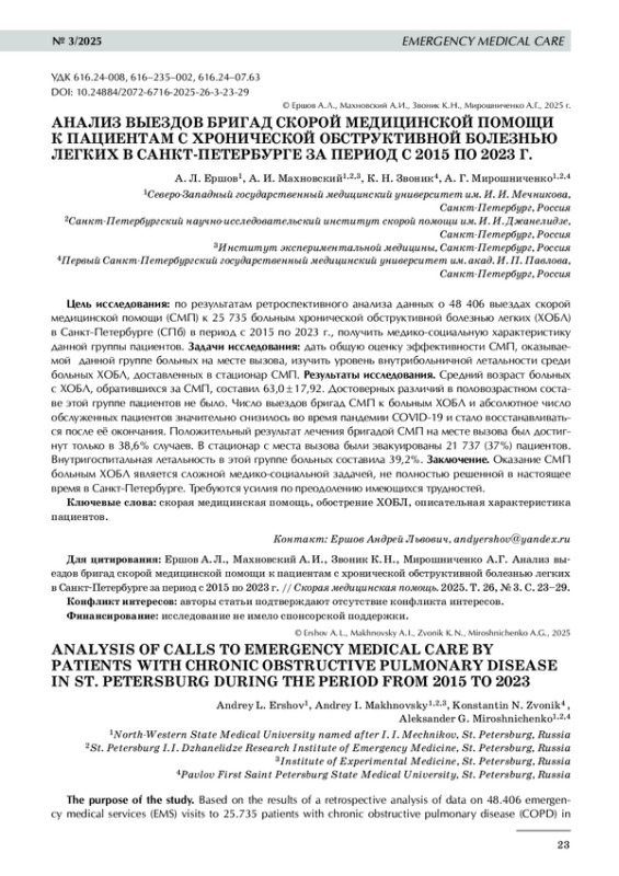 Цель исследования: по результатам ретроспективного анализа данных о 48 406 выездах скорой медицинской помощи (СМП) к 25 735 больным хронической обструктивной болезнью легких (ХОБЛ) в Санкт- Петербурге (СПб) в период с 2015 по 2023 г., получить медико- социальную характеристику данной группы пациентов. Задачи исследования: дать общую оценку эффективности СМП, оказываемой данной группе больных на месте вызова, изучить уровень внутрибольничной летальности среди больных ХОБЛ, доставленных в стационар СМП. Результаты исследования. Средний возраст больных с ХОБЛ, обратившихся за СМП, составил 63,0±17,92. Достоверных различий в половозрастном составе этой группе пациентов не было. Число выездов бригад СМП к больным ХОБЛ и абсолютное число обслуженных пациентов значительно снизилось во время пандемии COVID-19 и стало восстанавливаться после её окончания. Положительный результат лечения бригадой СМП на месте вызова был достигнут только в 38,6% случаев. В стационар с места вызова были эвакуированы 21 737 (37%) пациентов. Внутригоспитальная летальность в этой группе больных составила 39,2%. Заключение. Оказание СМП больным ХОБЛ является сложной медико- социальной задачей, не полностью решенной в настоящее время в Санкт- Петербурге. Требуются усилия по преодолению имеющихся трудностей.