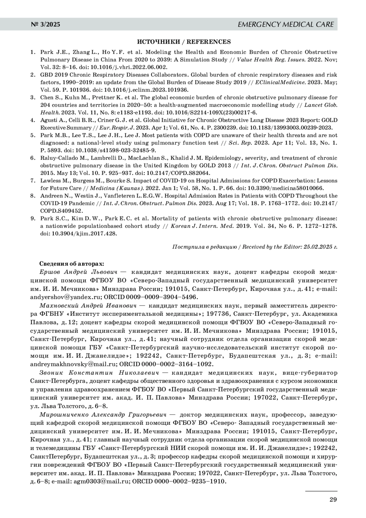 1. 	Park J.E., Zhang L., Ho Y. F. et al. Modeling the Health and Economic Burden of Chronic Obstructive Pulmonary Disease in China From 2020 to 2039: A Simulation Study // Value Health Reg. Issues. 2022. Nov; Vol. 32: 8-16. DOI: 10.1016/j.vhri.2022.06.002