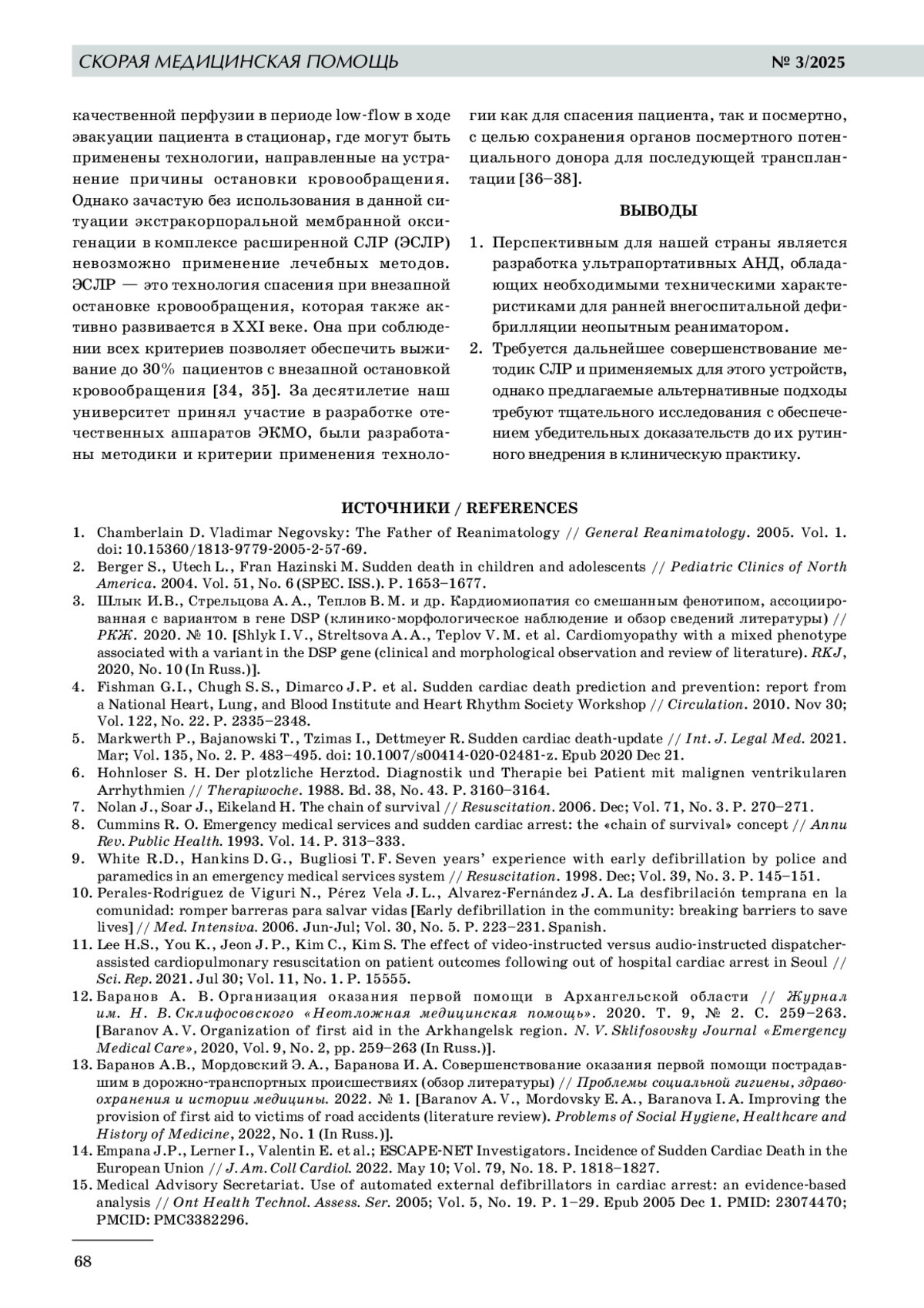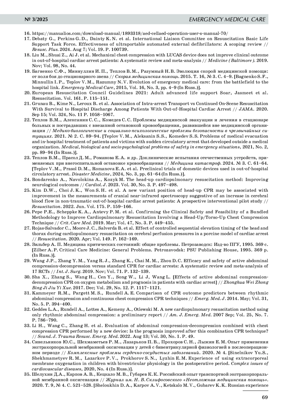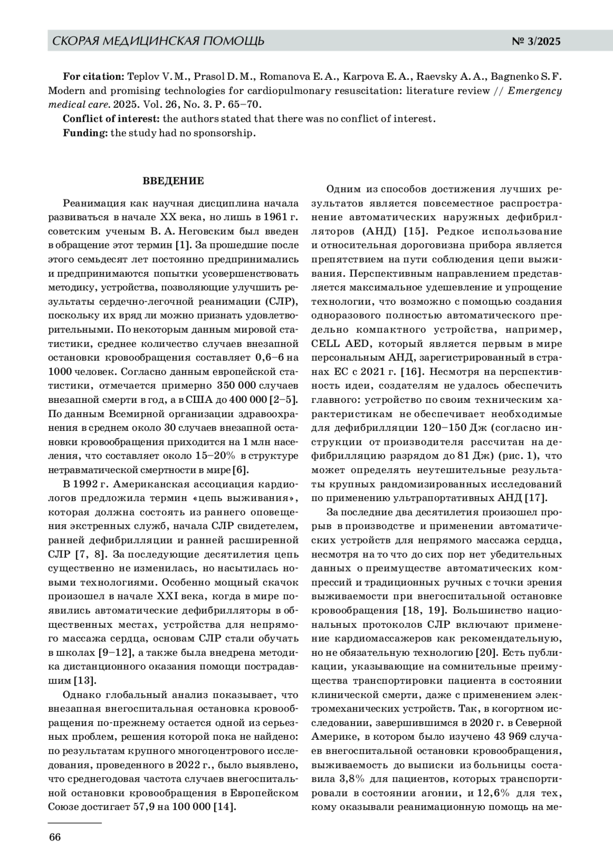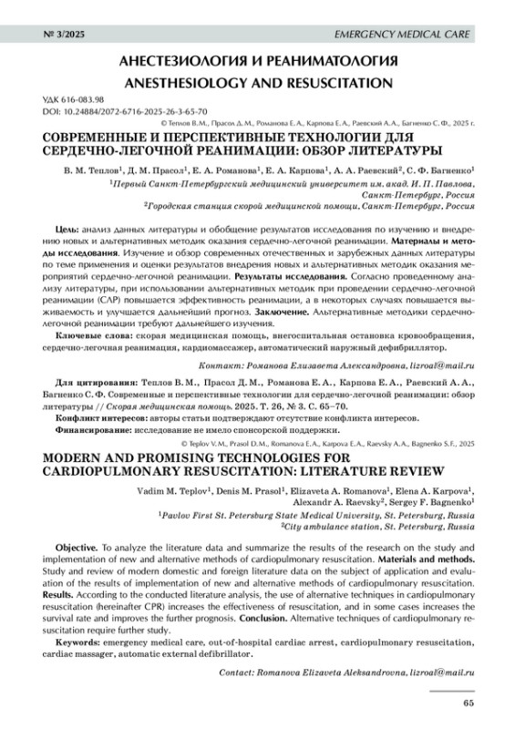 ТЕПЛОВ В. М., ПРАСОЛ Д. М., РОМАНОВА Е. А., КАРПОВА Е. А., РАЕВСКИЙ А. А., БАГНЕНКО С. Ф. СОВРЕМЕННЫЕ И ПЕРСПЕКТИВНЫЕ ТЕХНОЛОГИИ ДЛЯ СЕРДЕЧНО-ЛЕГОЧНОЙ РЕАНИМАЦИИ: ОБЗОР ЛИТЕРАТУРЫ // СКОРАЯ МЕДИЦИНСКАЯ ПОМОЩЬ. 2025. № 3, ТОМ 26
