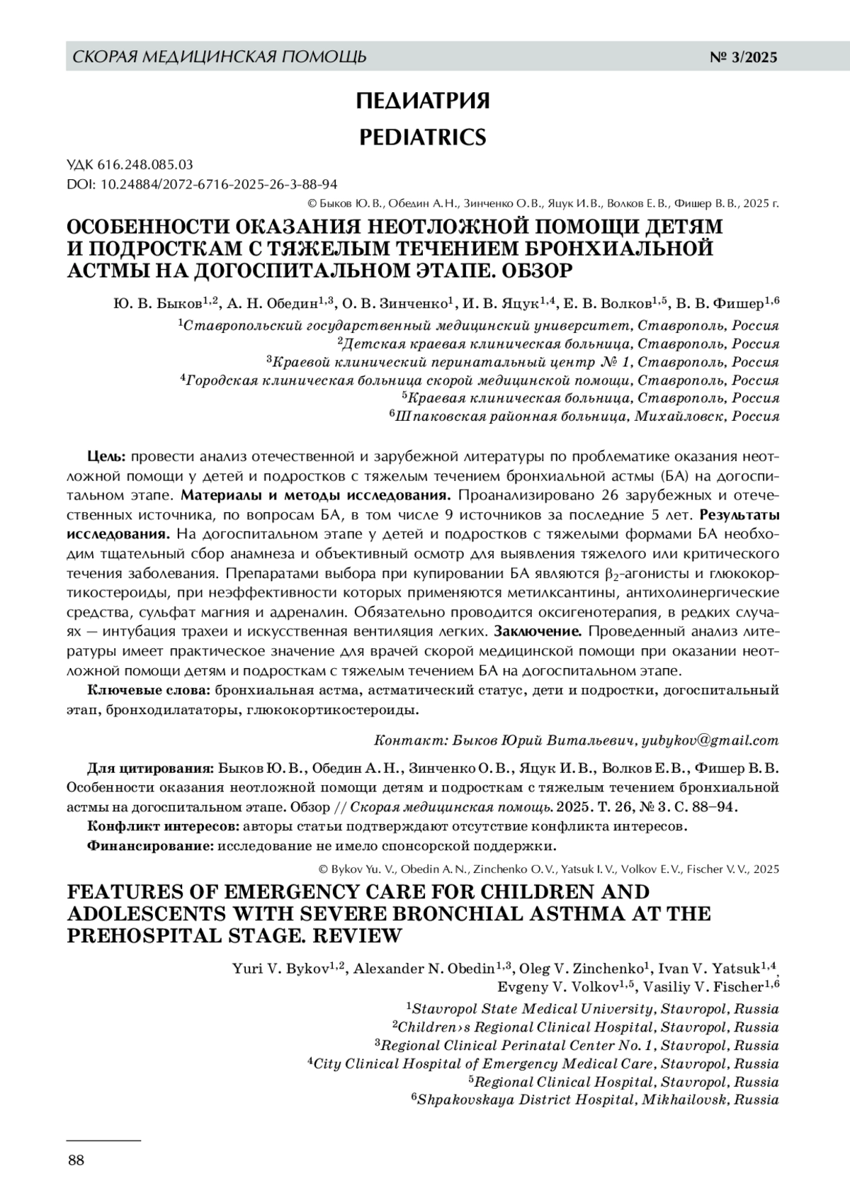 4. Быков Ю.В., Обедин А. Н., Муравьева А. А. и др. Интенсивная терапия астматического статуса в педиатрической практике // Инновационная медицина Кубани. 2025. № 1. С. 128-135.