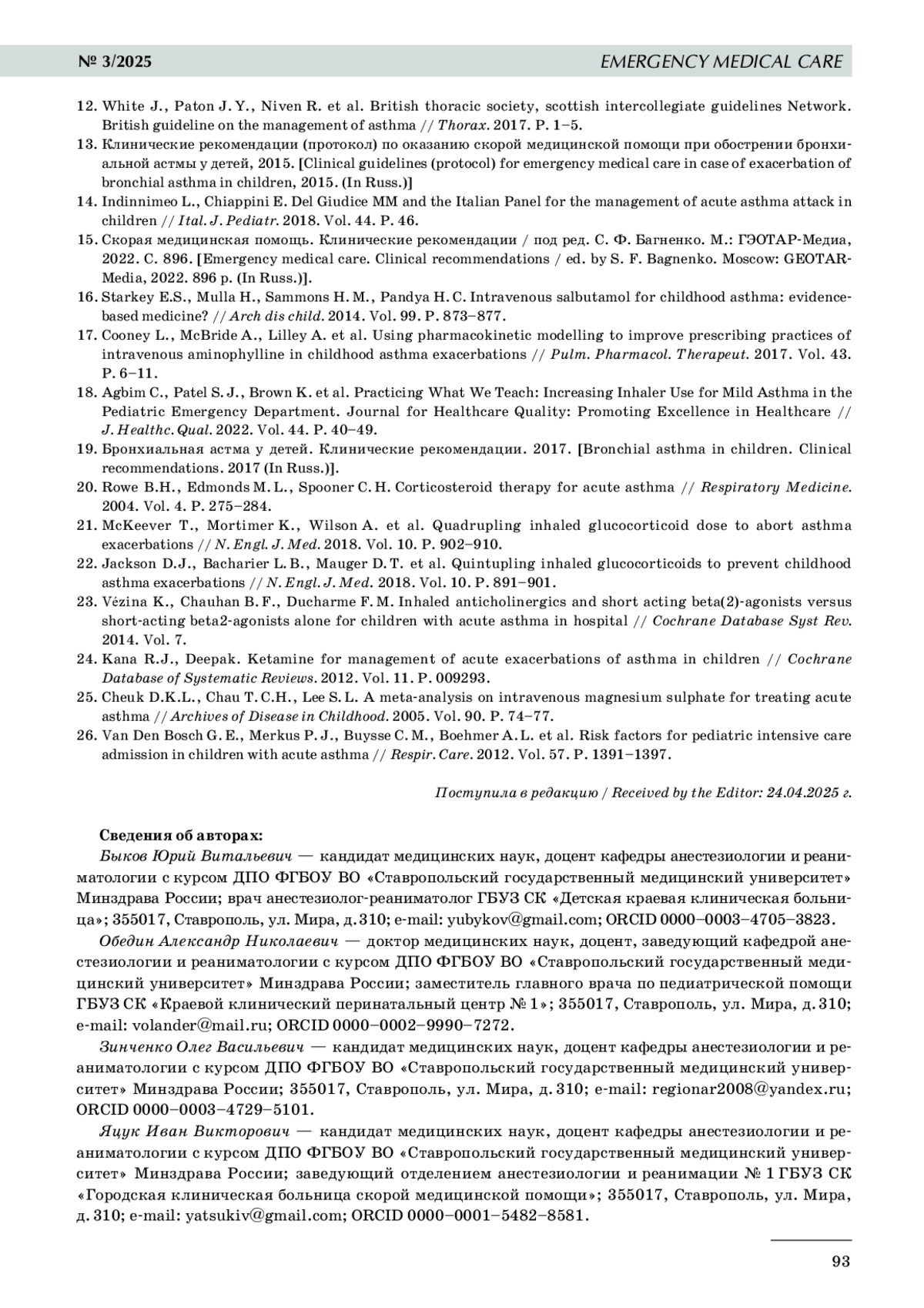 2. Craig S., Delardes B., Nehme Z. et al. Acute paediatric asthma treatment in the prehospital setting: a retrospective observational study // BMJ Open. 2023. Vol. 6. P. 073029.
