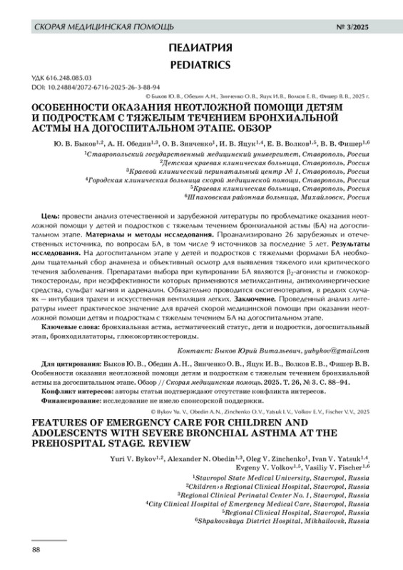 9. Быков Ю.В., Масальский С. С., Обедин А. Н. и др. Интенсивная терапия астматического статуса в педиатрии: учебное пособие. Ставрополь: Изд-во СтГМУ, 2024. C. 88.