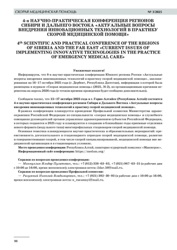 Сообщаем также, что 15–17 октября 2025 года в г. Горно- Алтайск (Республика Алтай) состоится 4-я научно- практическая конференция регионов Сибири и Дальнего Востока «Актуальные вопросы внедрения инновационных технологий в практику скорой медицинской помощи».