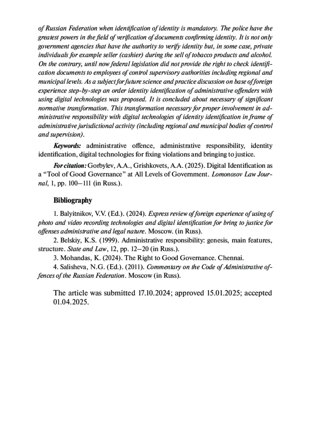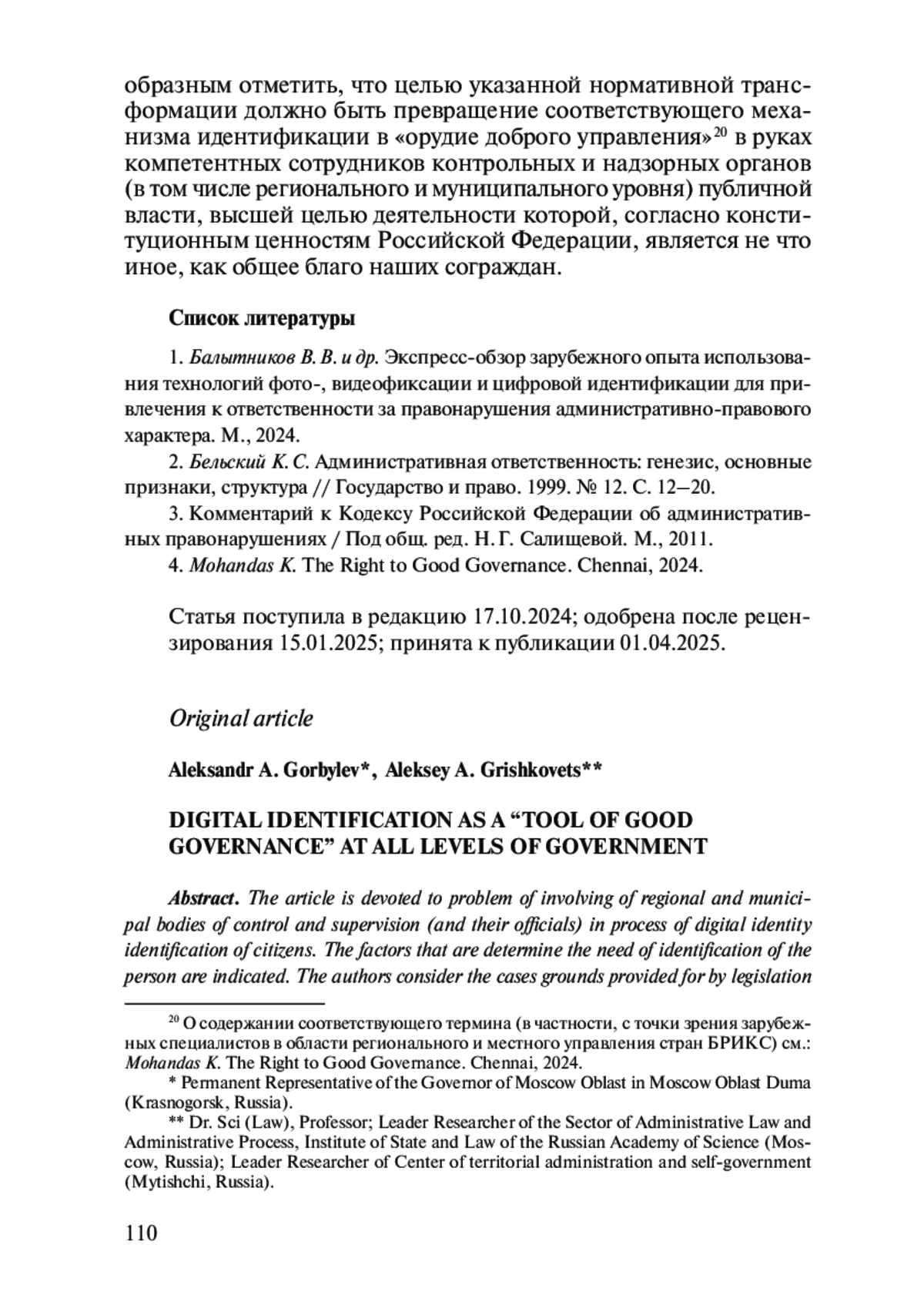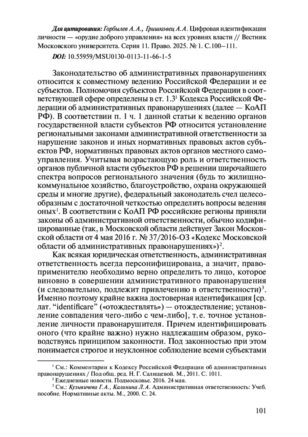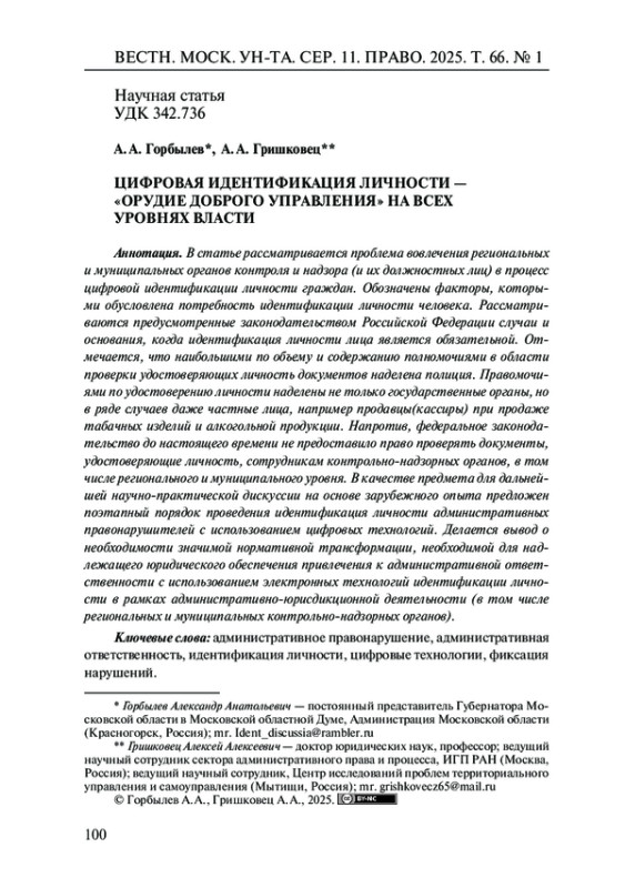 ГОРБЫЛЕВ А. А., ГРИШКОВЕЦ А. А. ЦИФРОВАЯ ИДЕНТИФИКАЦИЯ ЛИЧНОСТИ - «ОРУДИЕ ДОБРОГО УПРАВЛЕНИЯ» НА ВСЕХ УРОВНЯХ ВЛАСТИ // ВЕСТНИК МОСКОВСКОГО УНИВЕРСИТЕТА. СЕРИЯ 11: ПРАВО. 2025. № 1