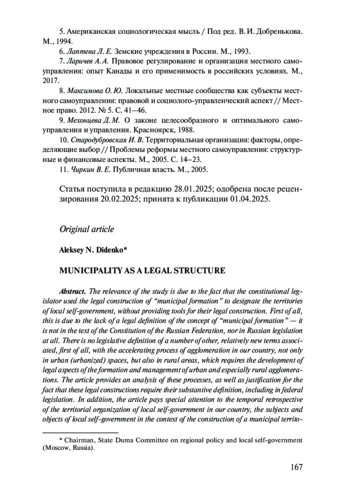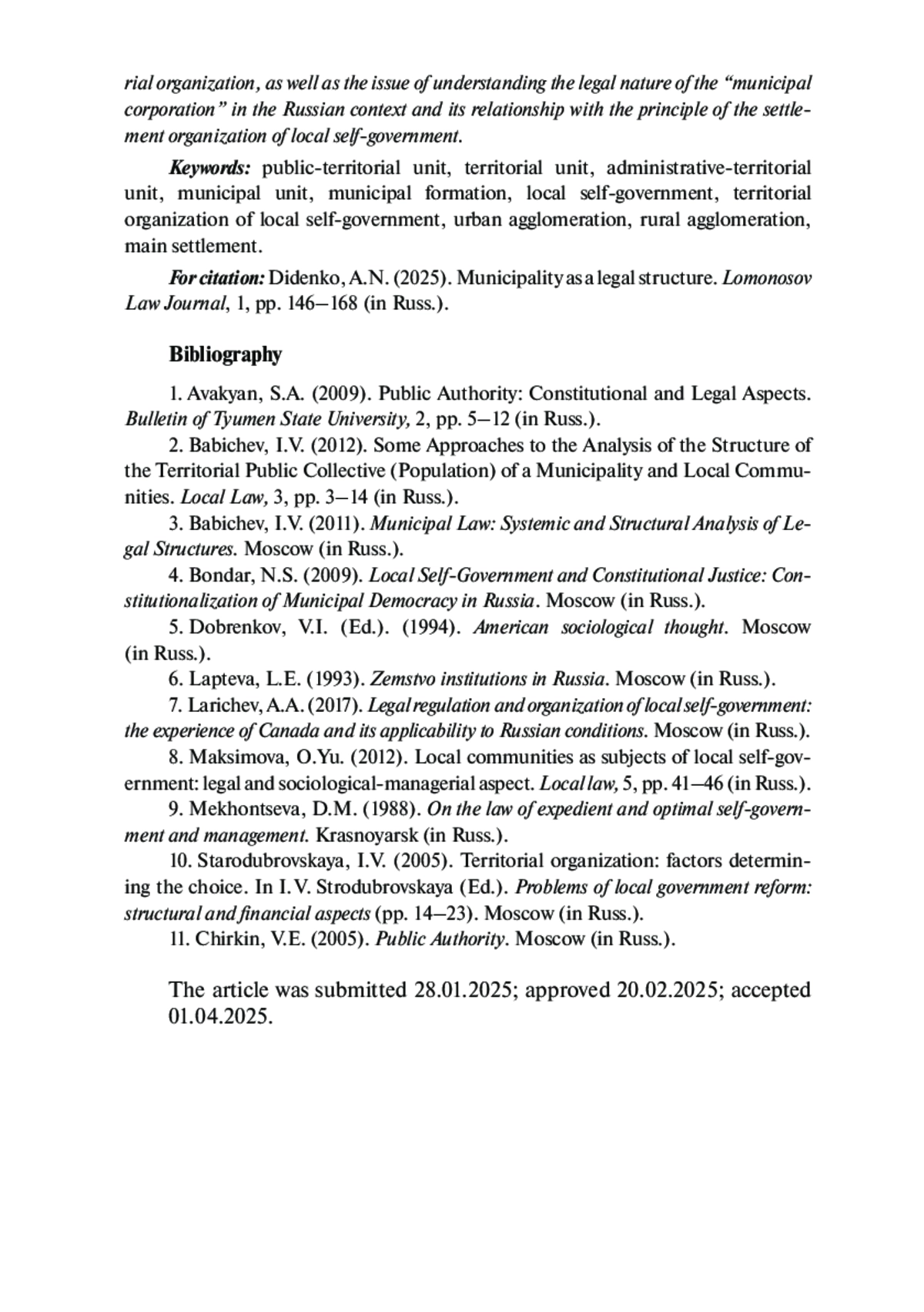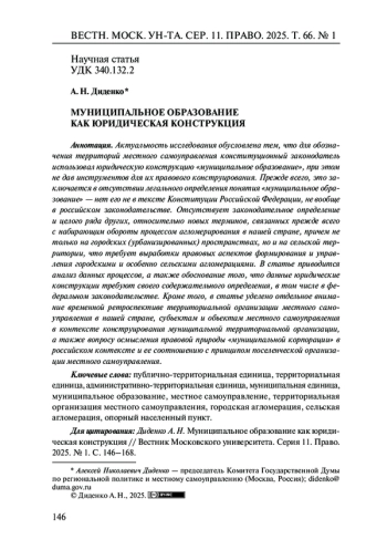 ДИДЕНКО А. Н. МУНИЦИПАЛЬНОЕ ОБРАЗОВАНИЕ КАК ЮРИДИЧЕСКАЯ КОНСТРУКЦИЯ // ВЕСТНИК МОСКОВСКОГО УНИВЕРСИТЕТА. СЕРИЯ 11: ПРАВО. 2025. № 1