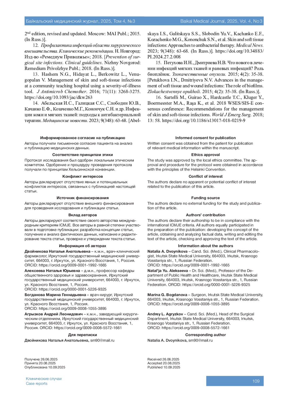 ДВОЙНИКОВА Н. А., АЛЕКСЕЕВА Н. Ю., БОГДАНОВА М. Г., АГРЫЗКОВ А. Л. ЦЕЛЛЮЛИТ В ПОСЛЕОПЕРАЦИОННОМ ПЕРИОДЕ: ОПИСАНИЕ КЛИНИЧЕСКОГО СЛУЧАЯ // БАЙКАЛЬСКИЙ МЕДИЦИНСКИЙ ЖУРНАЛ. 2025. № 3, ТОМ 4